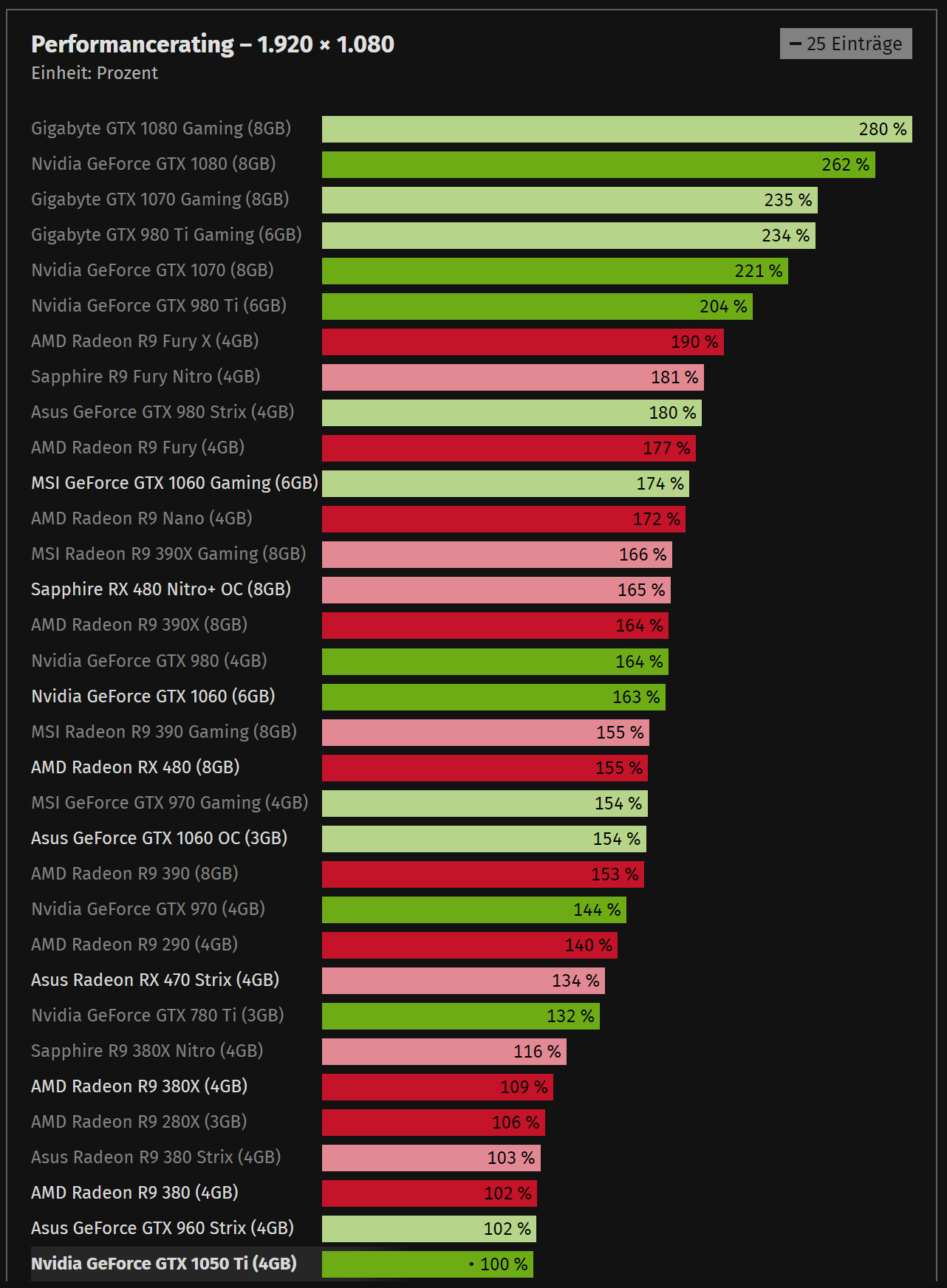 Die GTX 1070 dagegen war zu der Zeit (vereinfacht dargestellt) die zweitschnellste Grafikkarte die es überhaupt gab und mit 500€ kostete sie mehr als das Dreifache einer GTX 1050 Ti.
