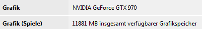 Ich habe eine GTX970 mit 4GB Speicher. Und wenn ich z.B. in GTA V in den Grafikeinstellung nachschaue stehen mir auch 4096MB zu Verfügung (abgesehen von dem Fehler das man nur 3,5GB benutzen kann). Nun habe ich in meinem System gesehen, dass mir 11881MB Grafikspeicher zur Verfügung stehen und nun möchte ich wissen ob und wenn ja wie ich diesen für Spiele usw. benutzen kann. Bilder zum PC im Anhang.
