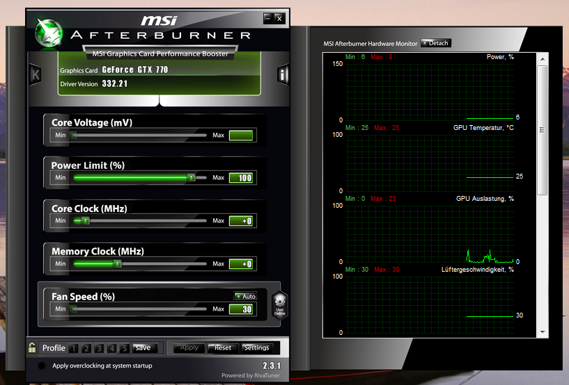 ich hab erst vor kurzem einen neuen PC erhalten mit einer Palit GeForce GTX 770 JetStream 2GB Grafikkarte.Jetzt hab ich mir mal MSI Afterburner runtergeladen um die möglichst beste Leistung rauszuholen ohne das aber irgendetwas kaputt geht.Leider ist es so,dass ich mich überhaupt nicht mit solchen Dingen auskenne und deswegen hoffe ich von euch einige Tipps zu bekommen.Bis jetzt wurde da noch nichts verändert.