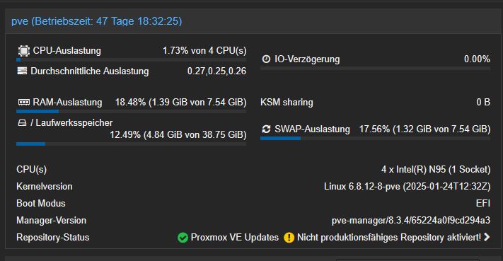 Habe bei mir home assistant, NginX, AdGuard Home, Faultwarden, Tandoor und ein kleines OMV für SMB-Freigaben unter Proxmox laufen. Docker mit portainer ist ebenfalls installiert, aber nicht alle Anwendungen sind im Docker, sondern auch als LXC, bzw. VM am laufen.
