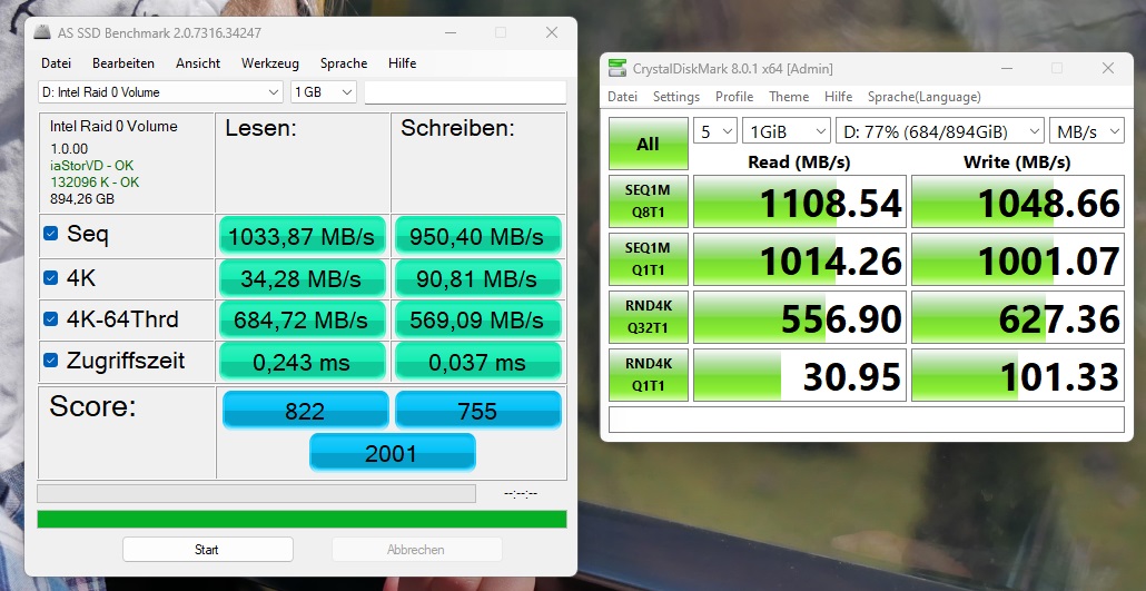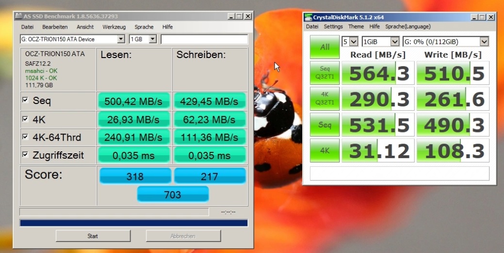 Im PC befindet sich derzeit eine 250 GB Samsung 960 EVO (PCIe 3.0) als Systemlaufwerk - das soll auch so bleiben. Für Ramschdaten (Downloads, zwischengespeicherte Dokumente etc) befinden sich zwei Toshiba/OCZ Trion TR150 SATA-SSDs mit jeweils 480 GB im RAID 0 (Kamikaze-RAID