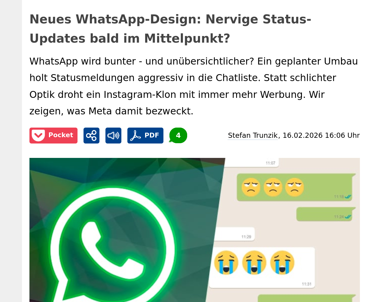 E: Das war ĂŒbrigens kein Sarkasmus. Ich warte wirklich drauf, denn ich möchte eine einheitliche OberflĂ€che haben. Und bis auf Kleinanzeigen und Whatsapp sind eigentlich alle anderen Apps schon lange (!) auf die neue Optik umgestellt worden. Auch, dass bei Whatsapp noch die Tastatur anders ist, stört mich ungemein.