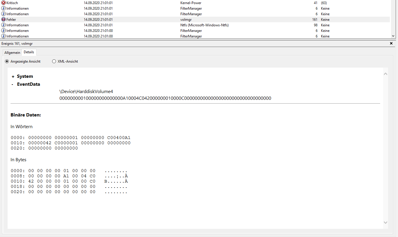 - Im Laufe des Betriebs kommt es dann noch zu Crashs wo der Bildschirm einfach schwarz wird und der Computer rebootet. Hier kommt in der Windows Ereignisanzeige kurz vor dem Fehler 41, der Fehler Code 161 bezogen auf "volmgr". Das scheint jedoch weniger zu passieren wenn das System unter Last ist, sondern meißt im Idle betrieb.