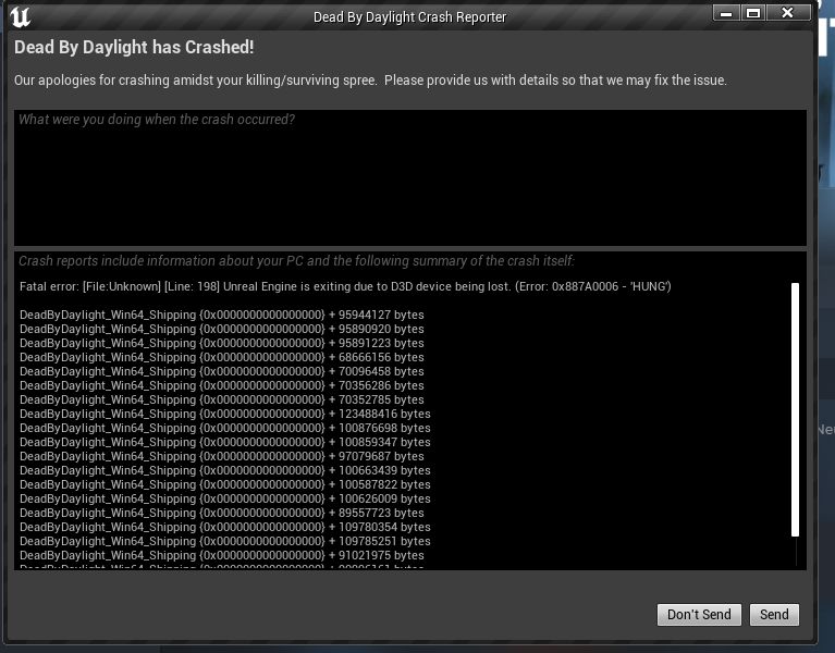 Das Spiel stürzt ab und es erscheint eine Absturzmeldung. Das Problem tritt jedoch NUR dann auf, wenn ich vom Hauptmenü des Spiels ins Game laden will oder wenn ich vom Game ins Hauptmenü zurückwechsele. Ab und an funktioniert es, dann mal wieder nicht. Sobald ich aber im eigentlichen Game selber bin, funktioniert alles reibungslos. Im Anhang habe ich einen Screenshot der Dead by Daylight Fehlermeldung. Elex II hat anscheinend einen DX Fehlerbericht abgespeichert, ebenfalls im Anhang.