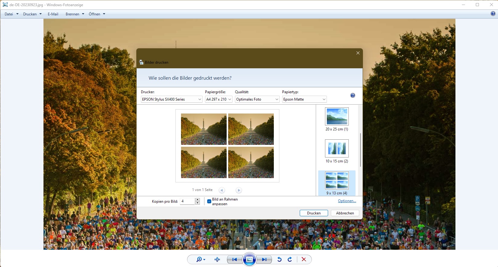 ich bin vor eine paar Tagen auf Windows 11 umgestiegen und stehe vor einem, eigentlich banalen, Druckerproblem. Ich möchte ein Foto mehrmals auf eine Seite drucken. Also mehrere Kopien pro Seite. In Windows 10 funktionierte das mit der "Windows Fotoanzeige" problemlos (siehe Bild)