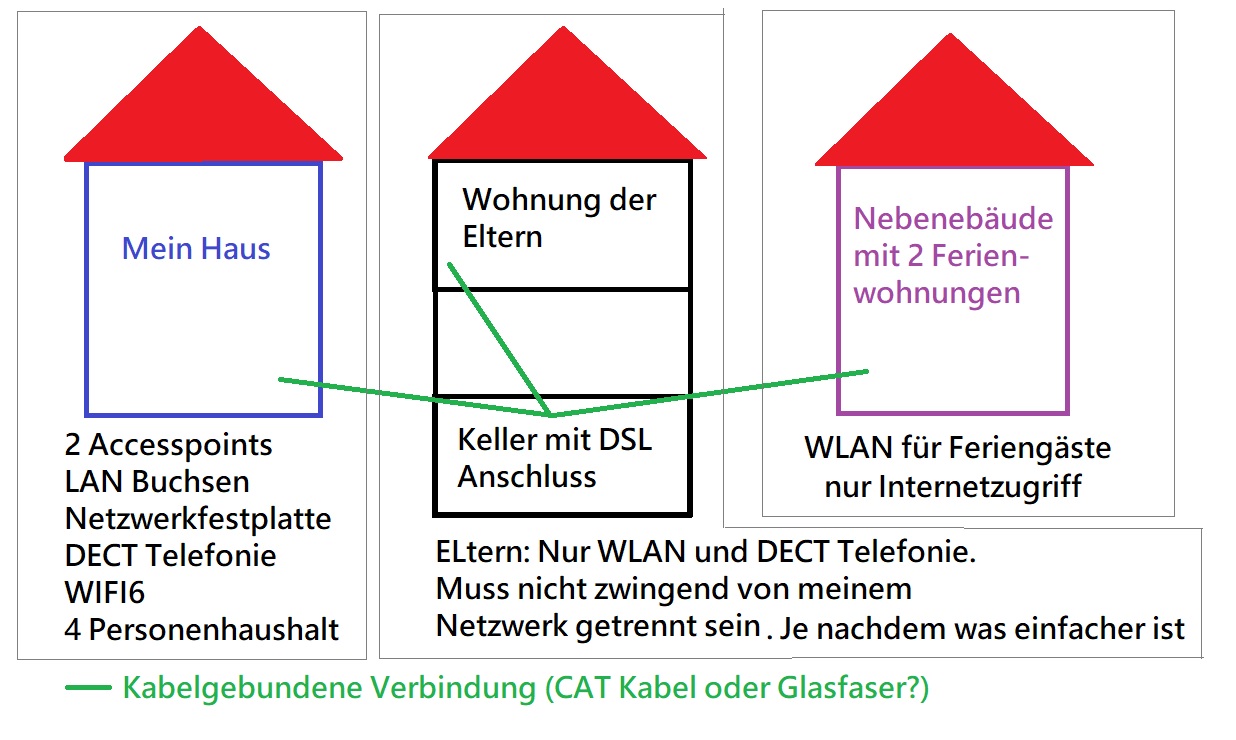 Und nun soll in einem neuen Anbau ebenfalls ein eigenes Netzwerk aufgebaut werden. Dieses soll wieder per Lan mit dem Keller verbunden werden. WLAN (Wifi 6), DECT Telefonie, 2 Access Points und diverse LAN Steckdosen (im Grunde wie ein Einfamilienhaus)