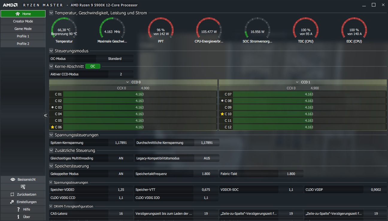 Der 5900x hingegen hatte schon im Idle seine 45°. Da konnte ich mit dem Energiesparplan gegenwirken und bin nun so bei 35°. Nach 2std Battlefield 5, hatte ich allerdings schon Peaks von 91° auf meiner WaKü gesehen. Standardmäßig sind es um die 84° nach ein paar Stunden. Im Spiel selbst habe ich keinen meiner Kerne jemals auf 4,9GHz gesehen. Da sieht laut Ryzen Master die CPU auch relativ unbelastet aus (85% vom Powerlimit, kein Kern über 4,1GHz)