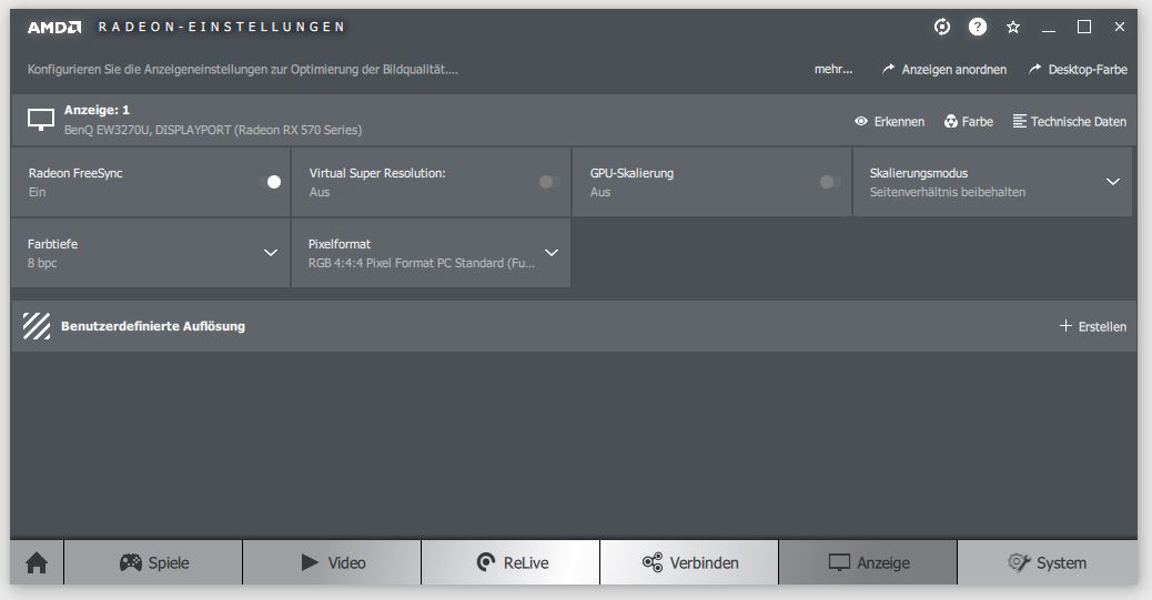 nachdem ich es gestern endlich geschafft habe, beide BIOS-Optionen meiner Sapphire Nitro+ RX 570 8GB verwenden zu können, stellt sich mir direkt eine ganze Reihe von neuen Problemen, die vor allem auch das Zusammenspiel mit meinem Monitor (BenQ EW3270U) betreffen. Diese würde ich gerne alle hier in diesem Thread bündeln, damit das ganze (auch für Leute, die später ähnliche Probleme mit dieser Kombination haben) übersichtlicher wird.