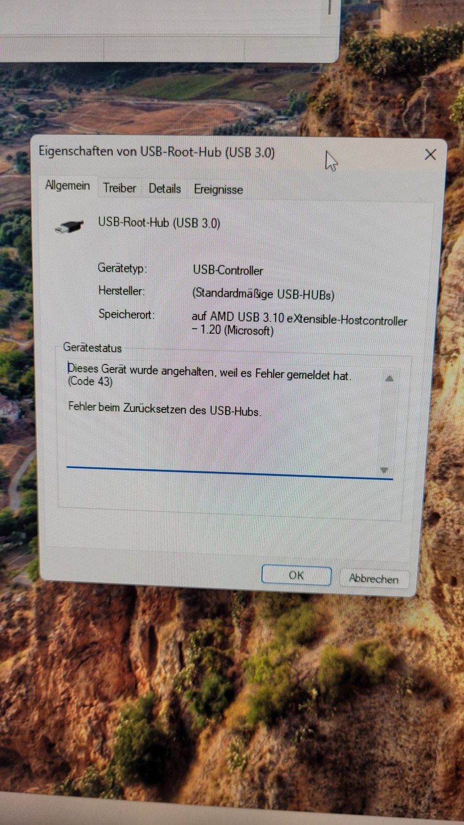 In Windows wird im Geräte-Manager das Gerät „USB Root Hub (USB 3.0)“ mit Code 43 und dem Hinweis „Fehler beim Zurücksetzen des USB-Hubs“ angezeigt.