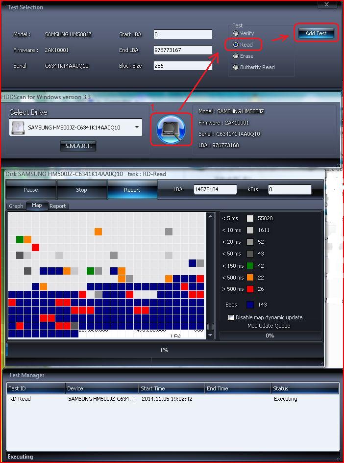 Was soll das bringen? Diese Scanns sind totaler Blödsinn, wen eine Platten wegen der Erwärmung die köpfe rekalibriert oder einem problematischen Sektor den zweimal liest, gibt es gleich einen Fehler. Ja es reicht schon wenn mal zwischendurch ein anderen Programm auf die Platte zugreift, schon kann die Zugriffszeit die 500ms übersteigen und es gibt auch gleich einen Zacken nach unten bei der Geschwindigkeitsmessung und gerade bei Windows Systemlaufwerken passiert sowas laufend und Windows greift sogar gerne mal auf Platten zu, von denen man eigentlich gar nichts will. Solche Programme sind daher mehr als fragwürdig.