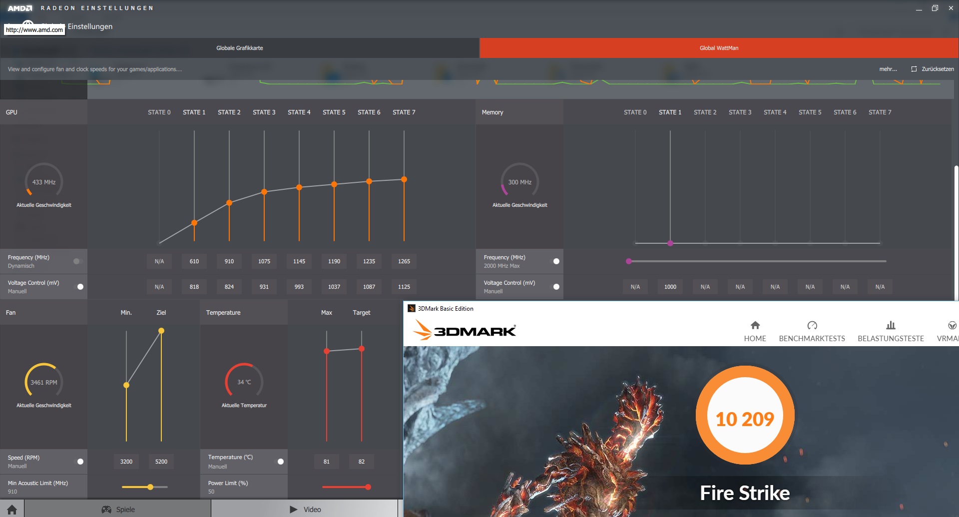 Mein System hat eigentlich ein guten Airflow. Mit der Standardlüfterverwaltung der Grafikkarte kam diese locker und schnell über 80 °C. Ich habe jetzt den Lüfter manual ab 2000 RPM laufen (für mich noch akzeptabel) und die Temp bleiben bei knapp unter 80 Grad unter Last (bspw. 1/2 Std. Overwatch) mit max. 2637 RPM.