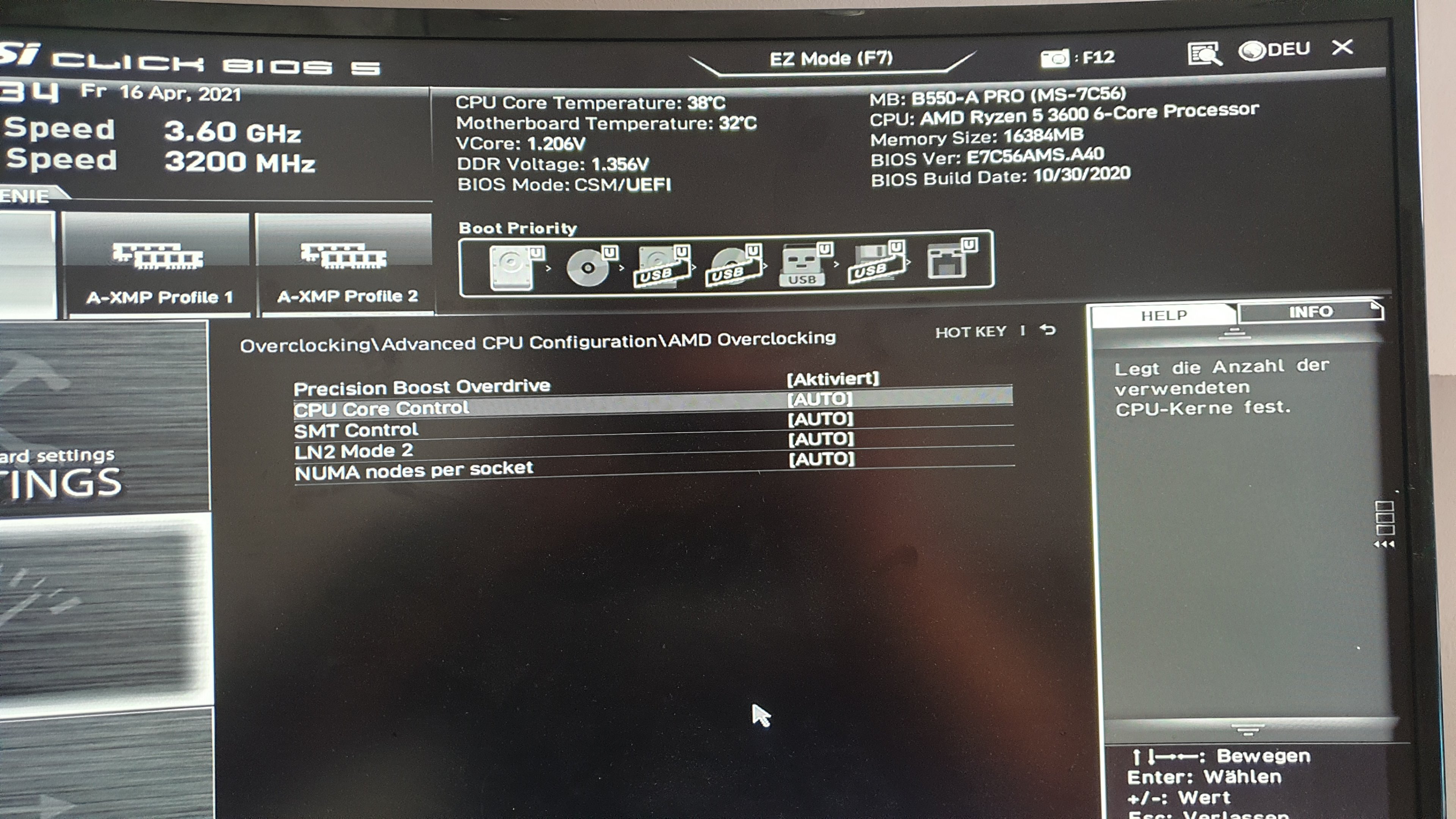 Auf dem 2. Bild vom BIOS sieht es sehr danach aus, dass die CPU fest auf 3,6GHz für alle Kerne eingestellt ist. Da geht die dann auch nicht drüber, weil manuelles festlegen logischerweise die automatischenn Boost-Mechanismen außer Kraft setzt.RoSch-31 schrieb:Bin jetzt im bios