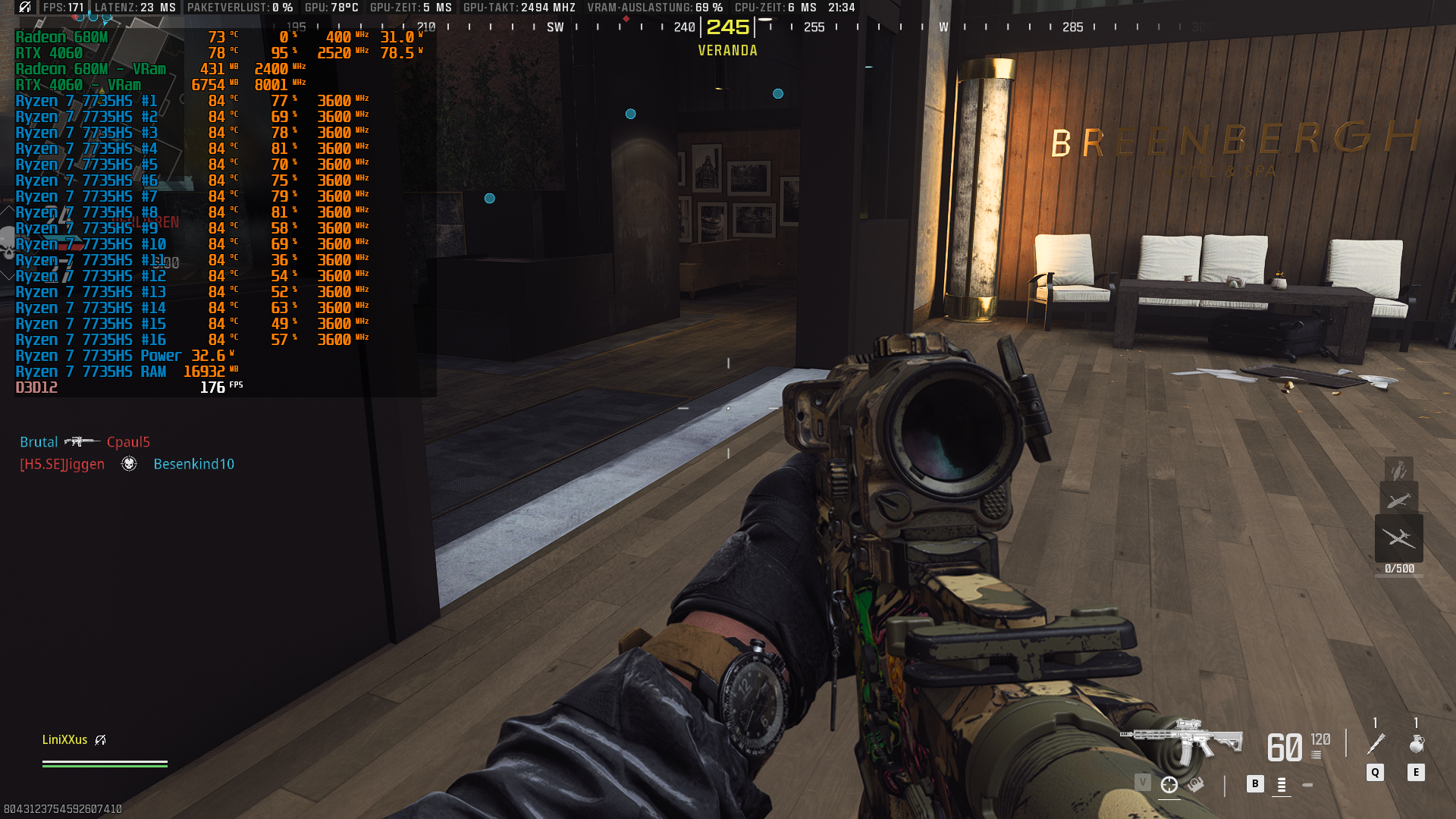 Im Game sieht man auch, dass der Arbeitsspeicher bereits mit 16,5 GB belegt ist und es eine gute Entscheidung war, auf 32 GB aufzurüsten. Wobei ich dieses auch wegen meiner Videobearbeitung gemacht habe. Denn zuvor liefen die Spiele auch mit 16 GB problemlos. Nur dann kann es passieren, dass auf die SSD ausgelagert wird. Tests mit 16 GB habe ich jedoch nicht unternommen.