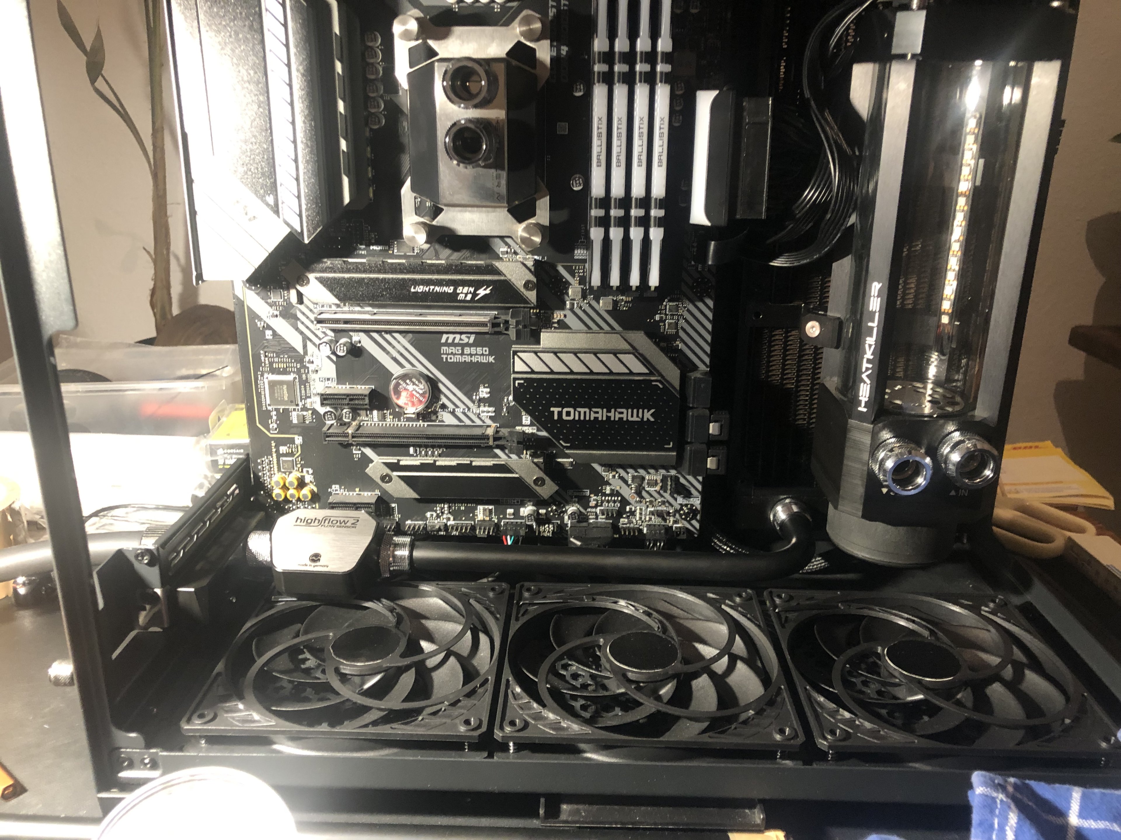 Habe heute meinen 280ger Raeistor gespült für die Seite, Lüfter dran und meine Heatkiller Tube mit der D5 PWM verheiratet. Für die Tube habe ich das Multiport Top mit zwei G1/4“ und einen 280ger HPE Radiator von AC.