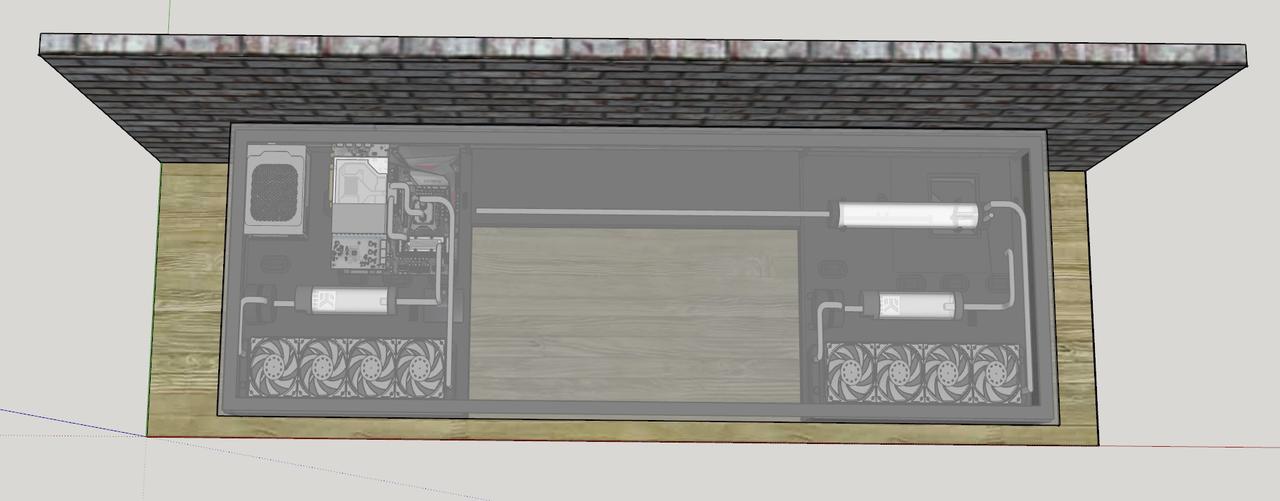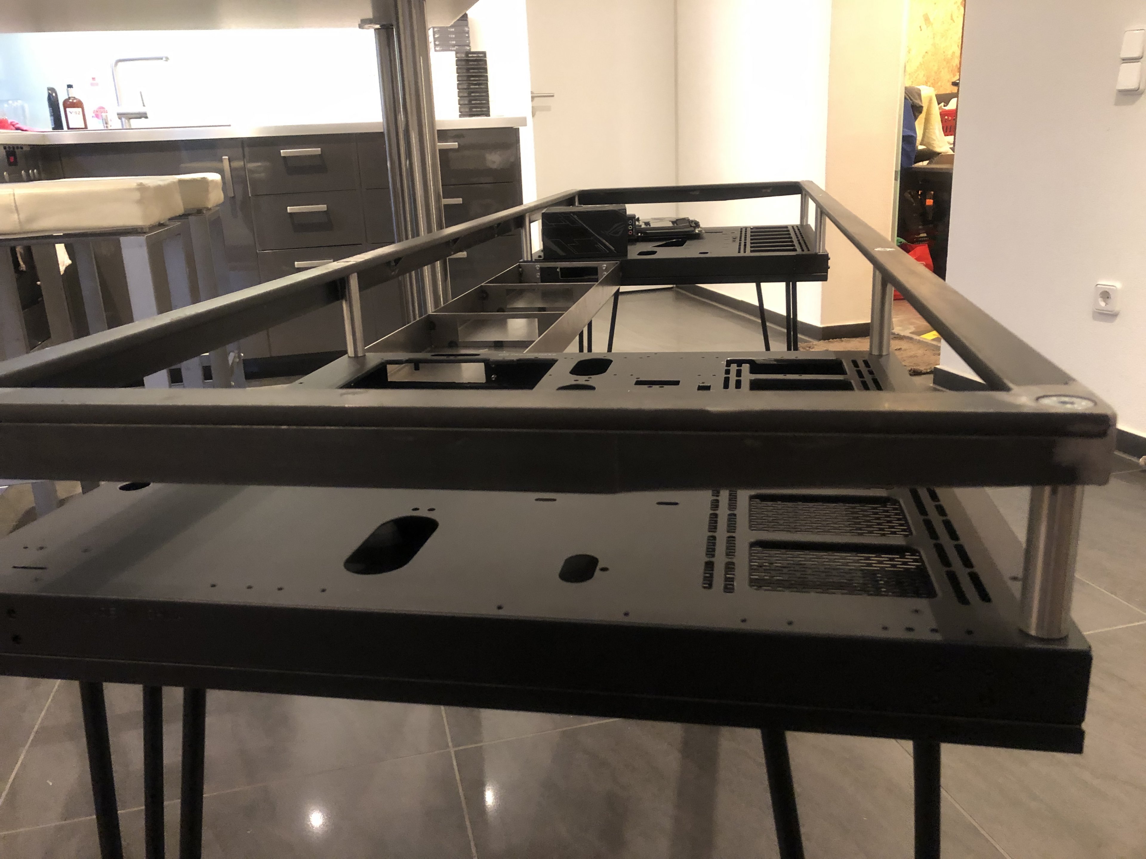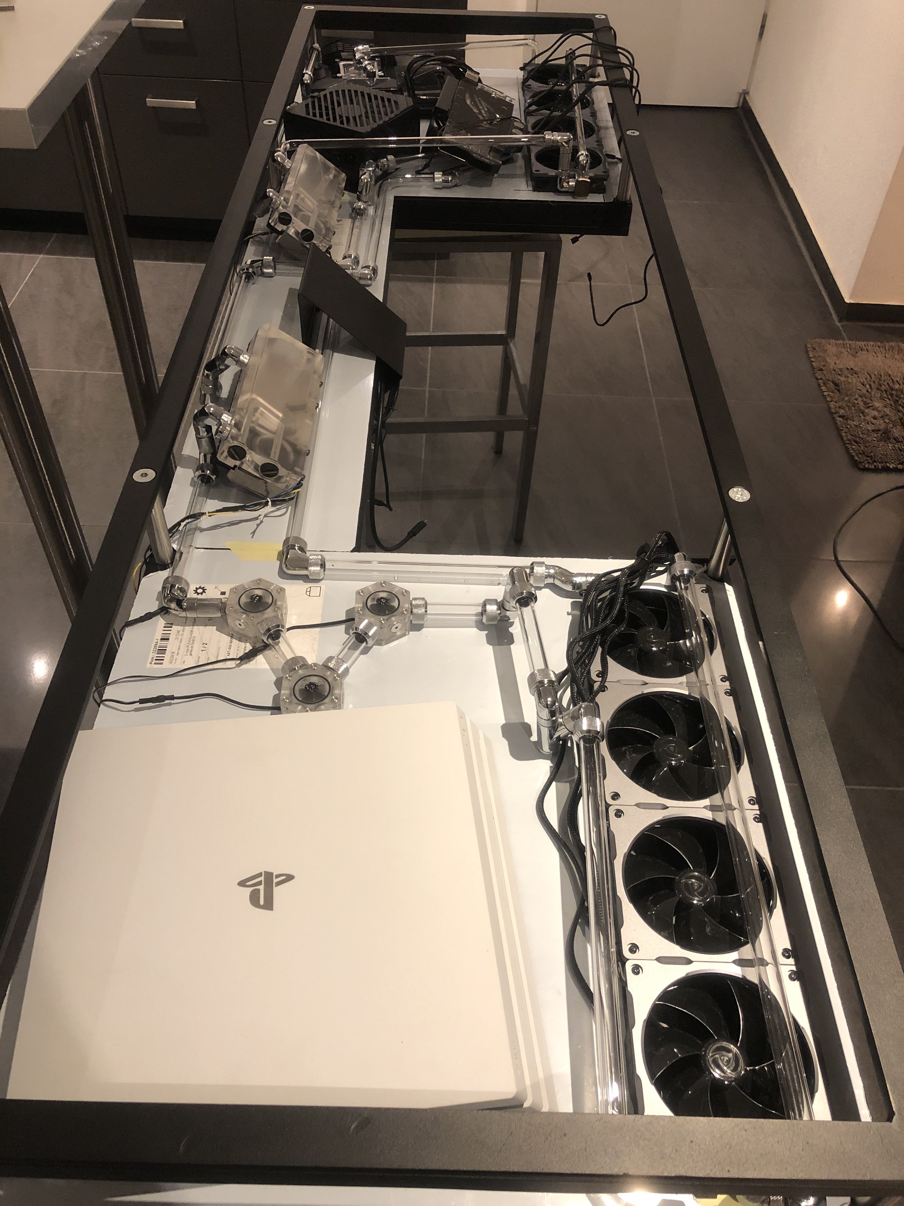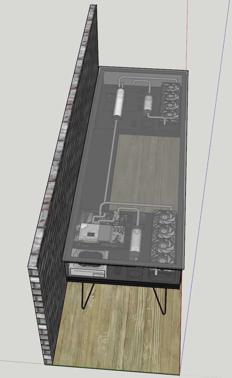 Bitte fixiert euch jetzt nicht so an der Hardware auf den Fotos. Ich habe einfach fertige Komponenten gesucht und mir was zusammengebastelt. Das selbe gilt für die Wasserkühlung. Die Art der Verlegung und die Farbe der Rohre sind nicht final. Die Bilder sollen euch "nur" in etwa den Tisch und die Bauart zeigen.