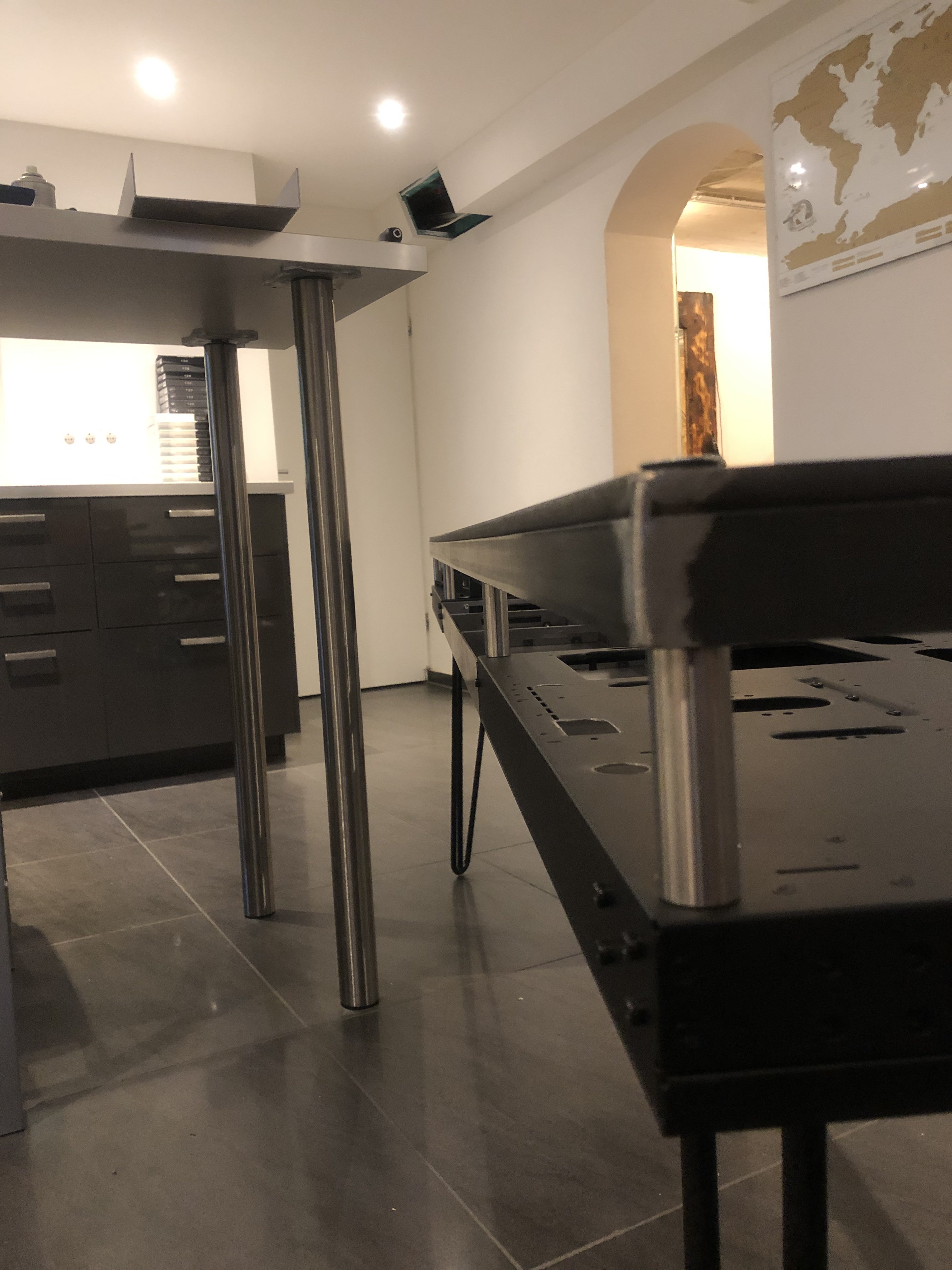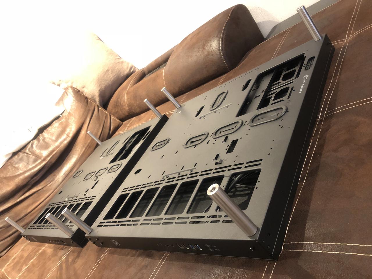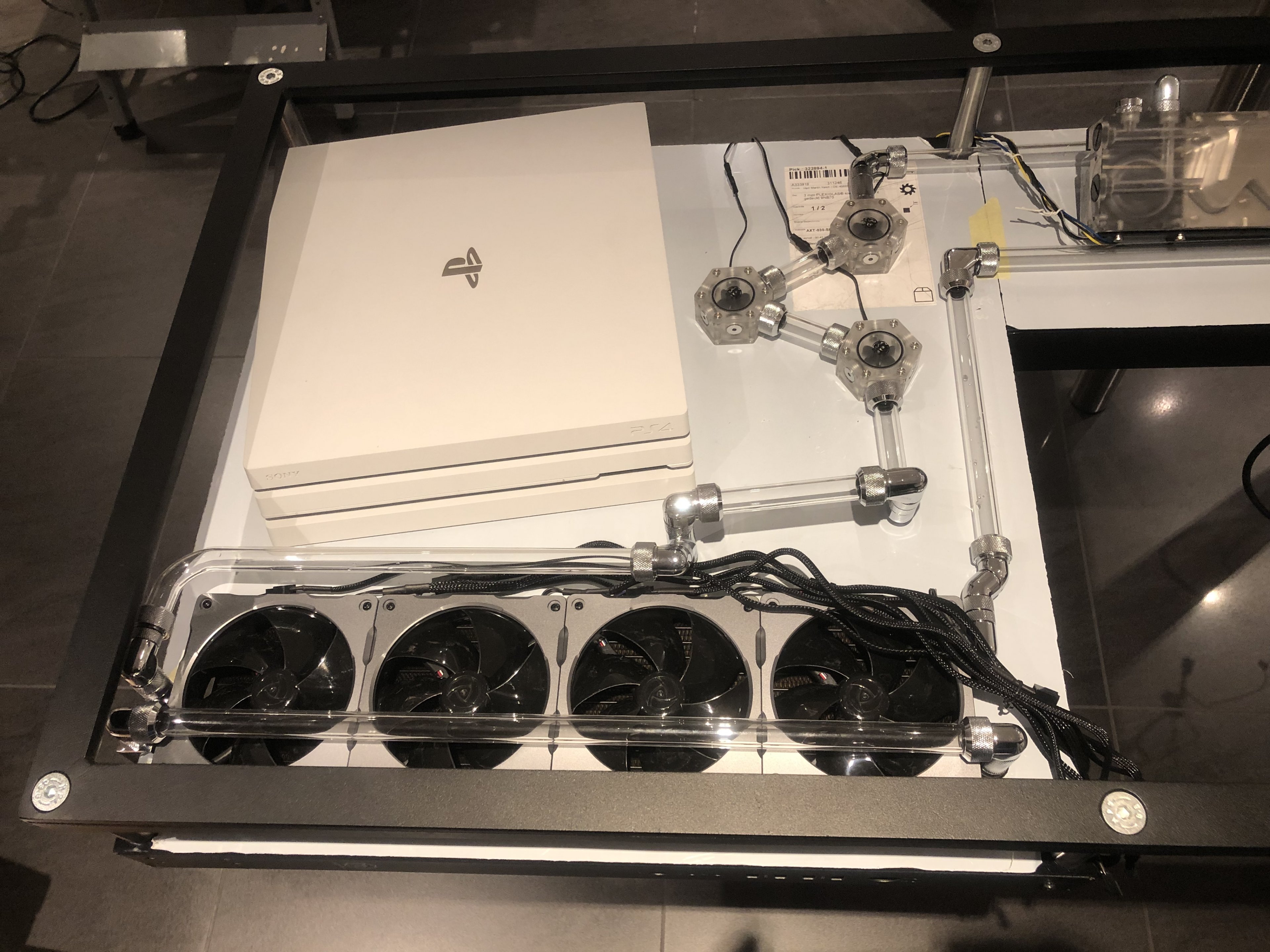 Bitte fixiert euch jetzt nicht so an der Hardware auf den Fotos. Ich habe einfach fertige Komponenten gesucht und mir was zusammengebastelt. Das selbe gilt für die Wasserkühlung. Die Art der Verlegung und die Farbe der Rohre sind nicht final. Die Bilder sollen euch "nur" in etwa den Tisch und die Bauart zeigen.