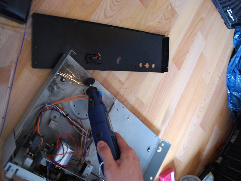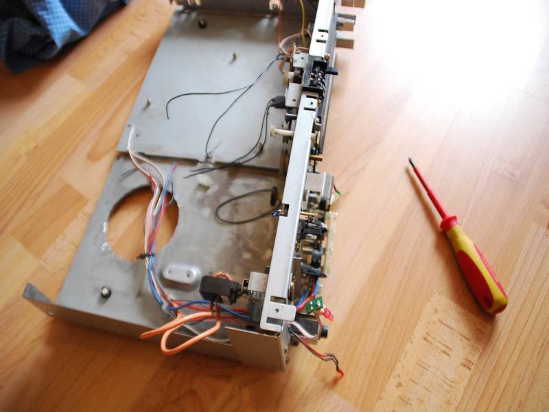 Die Frontblende wurde abgemacht um, die Knöpfe loszuschrauben, weil die auf dem Board verlötet sind und am Gehäuse verschraubt waren.