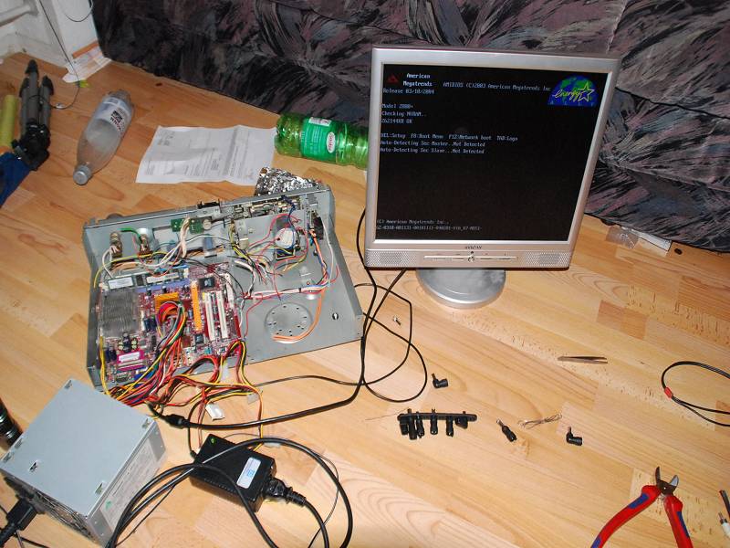 Da ich im Internet nichts passendes gefunden habe, bin ich einfach mal auf unseren Dachboden gegangen. Hab dann oben noch 2 alte PC's gefunden. Einen Pentium 3, war mir aber zu langsam, und einen Athlon XP 2800 mit 256MB Ram und das alles auf einem µATX Board...