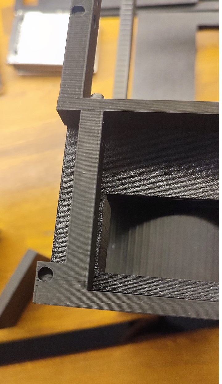Ich habe am gesamten Gehäuse Bohrungen für 5mm Magnete vorgesehen, mit denen ich die äußeren Blenden magnetisch anbringen wollte. Leider haben diese hier und da nicht gehalten, weil die Maßhaltigkeit nicht überall gegeben war. So musste ich bestimmt die Hälfte der Magnete einkleben (ist ne schöne Sauerei - Polarität sollte man auch beachten; am besten überall einheitlich.. und das noch bevor man sie einklebt