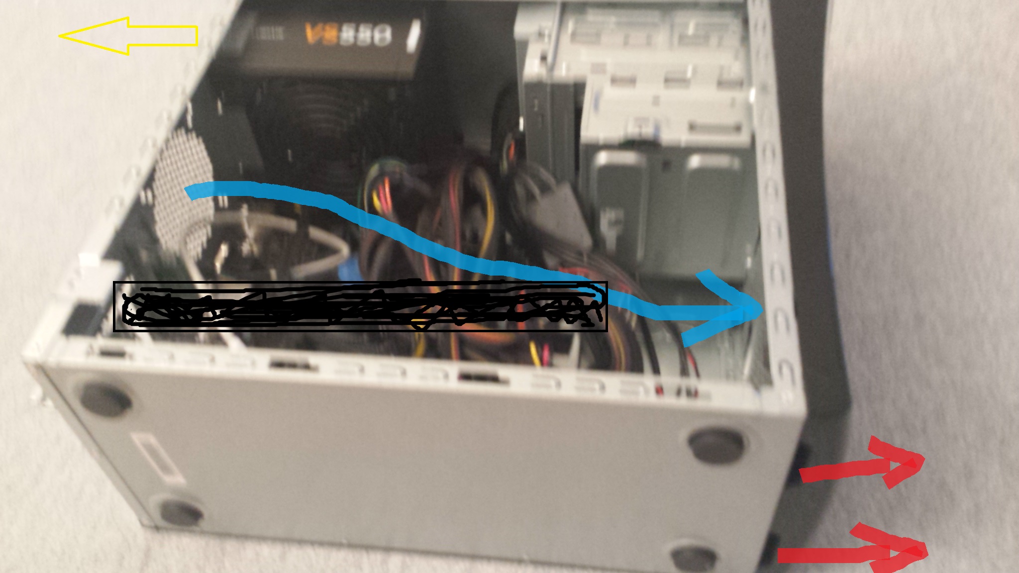 Ich hab das erste mal selbst einen PC aufgerüstet (alter office PC, jtz Gaming PC) also kenn ich mich mit der Belüftung nicht so aus. Das Netzteil meines PCs ist oben d.h. gpu ist unten. Ich habe eigentlich in diesem Gehäuse nur einen Lüfterplatz (120mm) unterm Netzteil. Allerdings könnte man vorne unten also vor der gpu an einem Gitter einen weiteren Lüfter befestigen der von unten Luft saugt. Meine Idee wär einen Luftstrom von hinten nach vorne zu erzeugen damit das Netzteil frische Luft bekommt.