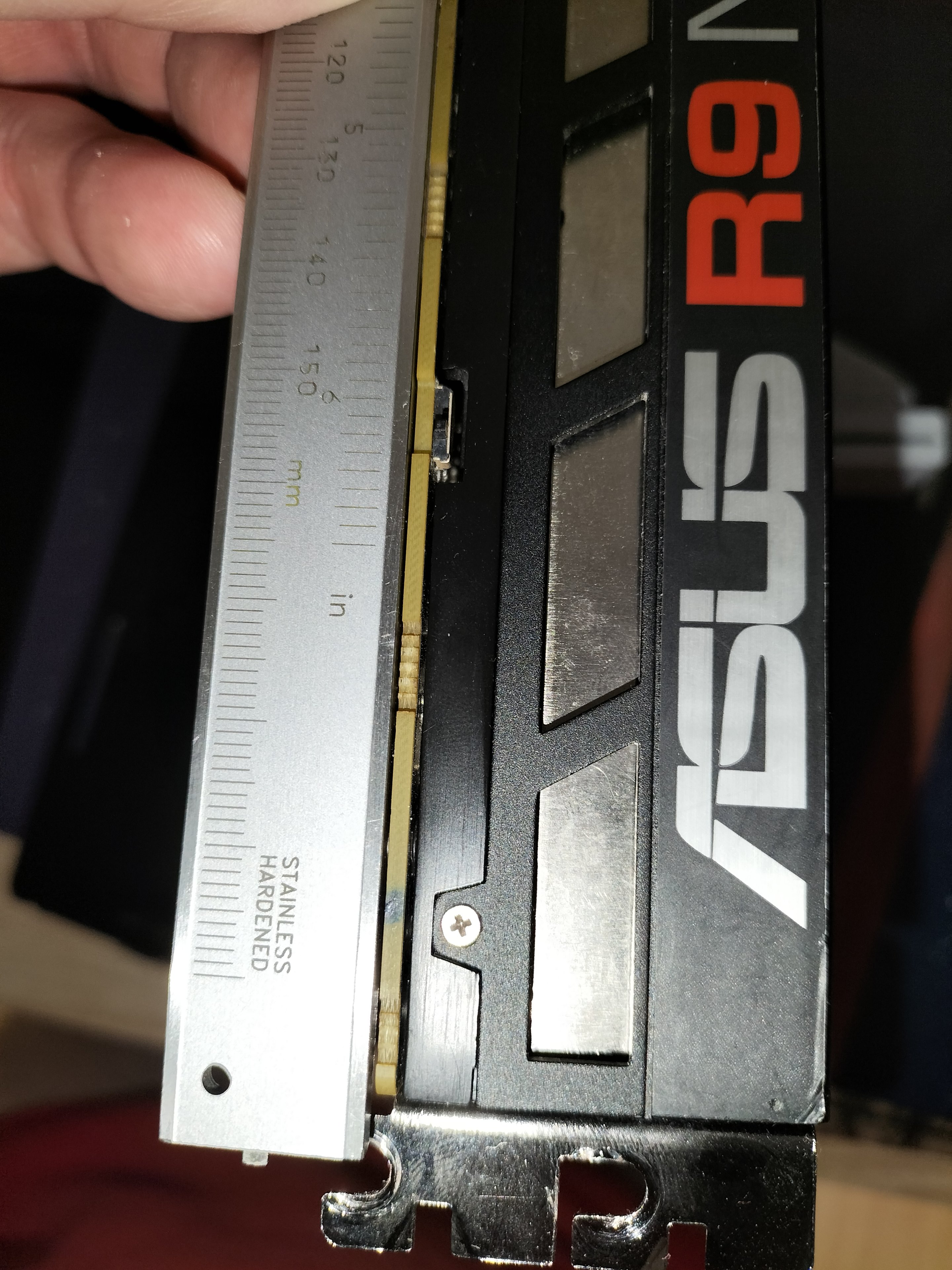 Es kann auch nicht schaden, die HW "stehend" zu testen, also das Mainboard auf der Tischplatte bzw. ner flachen Unterlage aufzubauen. Manchmal machen sich Fehler erst "hängend" im Slot bemerkbar oder die Karten werden nicht erkannt, gerade wenn das PCB schon etwas gebogen ist. (Deins sieht aber gut aus, hätte mich bei so ner kurzen Karte auch gewundert.) Wenn die Teile stehend laufen, und hängend nicht, hat es vermutlich was mit Haarrissen unter Mem/GPU zu tun. Ist aber eher ein Problem von schweren, langen Karten. Und wenn bei dir beide R9's komisches Verhalten zeigen, würde ich definitiv erstmal die Softwareseite checken.