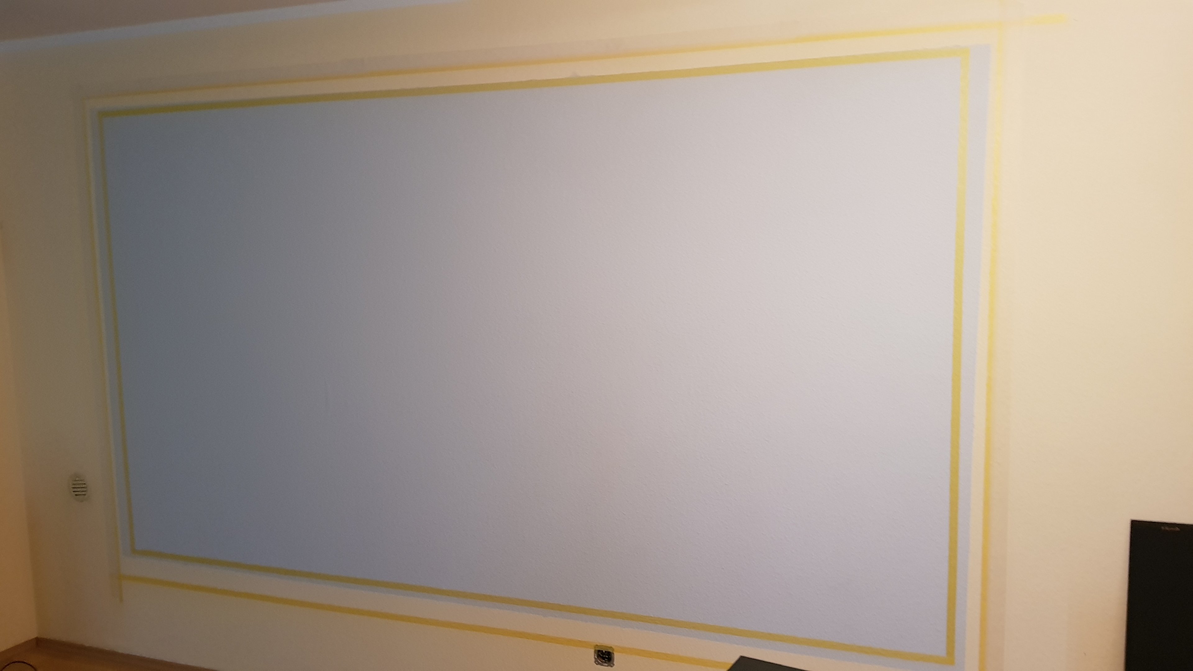 Dem Projektor eine neue und stabilere Deckenhalterung spendieren und der Black Widow Projektionsfläche eine schwarze Umrandung malen die genau der Ausleuchtung vom Projektor entspricht.
