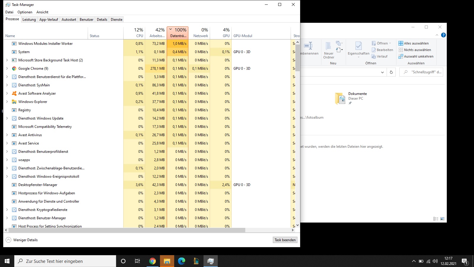 ich bin leider nicht sehr wissend bei diesem Thema daher wende ich mich hilfesuchend an euch. Ich habe ein Laptop (ca 4 Jahre alt ). Es ist leider sehr langsam und im Task Manager wird mir immer eine Auslastung von 100% angezeigt (bild eingefügt) . Habe mehrere Tipps aus dem Internet befolgt aber nichts hat geholfen. Zuletzt habe ich Windows Defender deaktiviert und Avast installiert da Defender anscheinend Probleme gemacht hat. Mehrere Virenscans durchlaufen lassen und eine Reinigung mit CCleaner. Leider hat sich nichts geändert. Meistens braucht es lange zum Starten von Windows. Dann ist es unglaublich langsam und hängt sich im öfteren auf ( bedeutet Bildschirm friert ein) . Surfen und andere Dinge frieren dann auch oft ein und manchmal hilft nur noch ein Hard Reset. Vlt könnt ihr mir helfen . Danke schonmal !