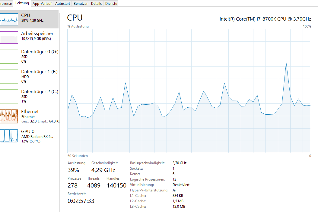 Im Taskmanager konnte ich keine Veränderungen oder ähnliches feststellen, die Grafikkarte und CPU waren beide auf ungefähr derselben Auslastung in jedem Spiel.