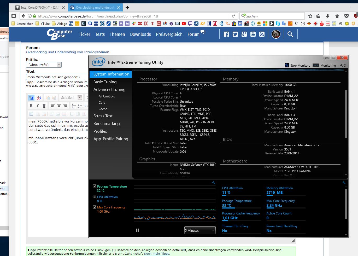 mein 7600k hatte bis vor kurzem noch den alten Microcode 0x42. nun mach ich heut früh mit der neuen version von cpuz mal eben nen bench und seh dann auf der seite das sich mein microcode auf einmal in 0x5E geändert hat! wie kann das sein? hab weder bios geupdatet(weil noch kein neues vorhanden ist) noch sonstwas verändert. das einzigst neue ist 1709. ansonsten wurde nix erneuert.