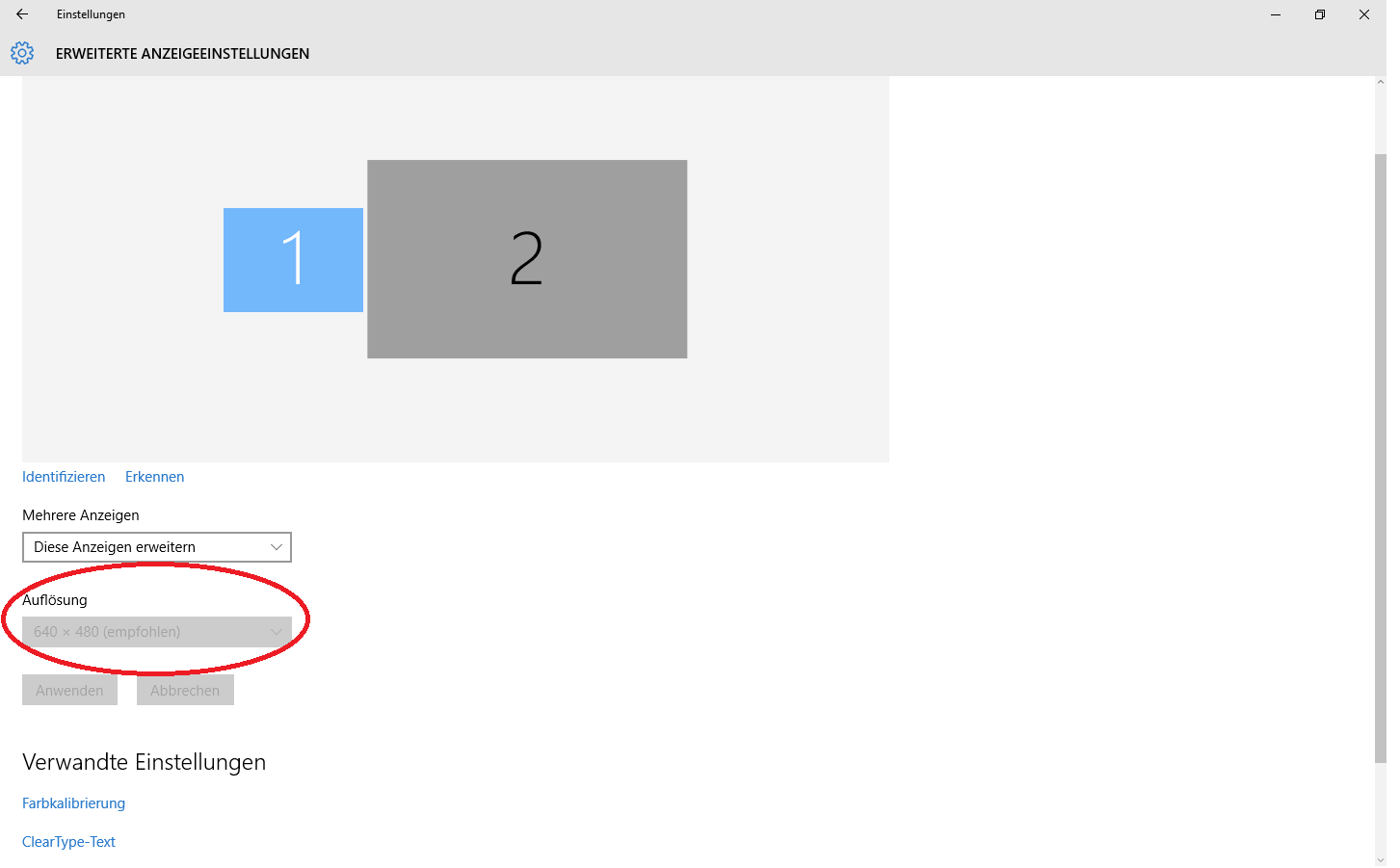 Dann habe ich über "Rechtsklick > Anzeigeeinstellung" die Auflösung überprüft und hab bemerkt, dass die Auflösung auf 640 x 480 eingestellt ist (mit einem empfohlen dahinter) statt wie eigentlich auf 1680 x 1050.