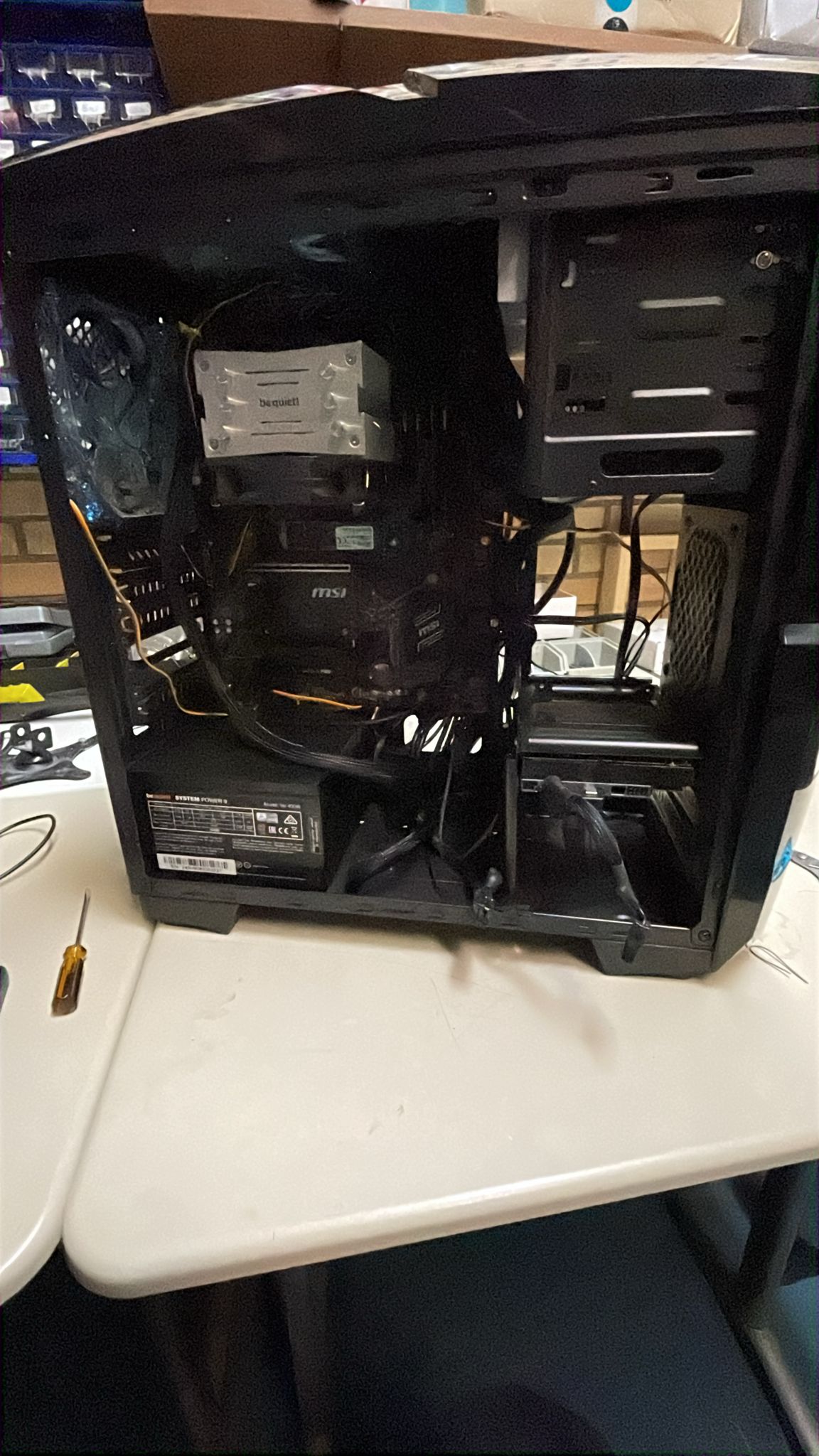 Alles ab. Alles! Nur Mainboard mit eingebauter CPU, CPU-Kühler und einem einzelnen Arbeitsspeicher-Riegel.