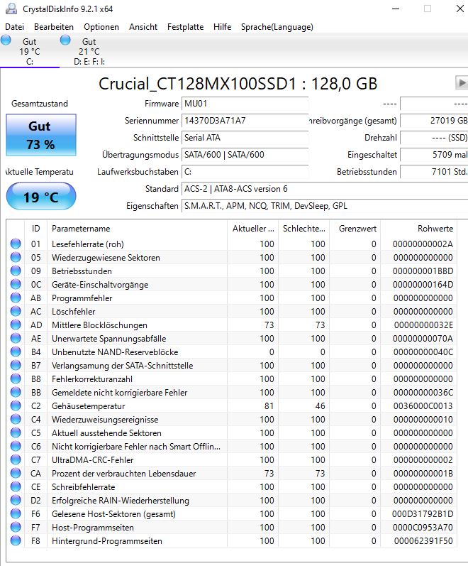 Die SMART Werte sehen soweit in Ordnung aus. Die SSD ist nicht mehr die juengste, aber auf dem Papier noch fit. Was aber nicht unbedingt was heissen muss.