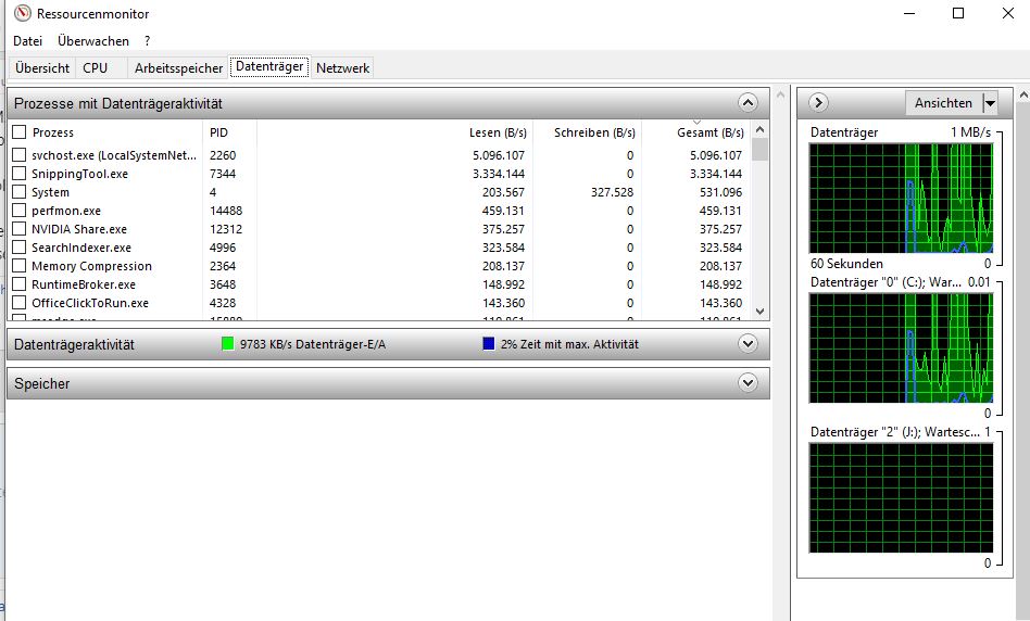 Schaue mal im Ressourcenmonitor im Disk Reiter nach der Auslastung der C Platte, und nach der Warteschlangenlaenge.