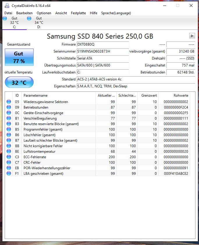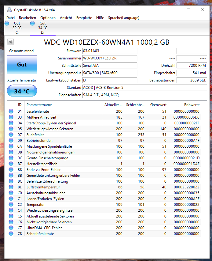 Hier noch die smart Werte falls das so richtig ist.