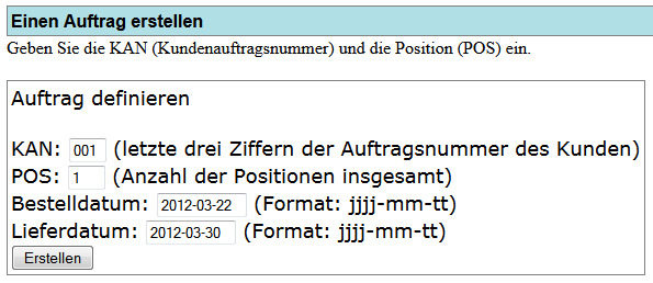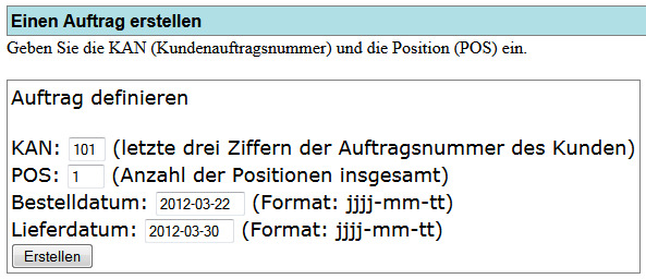 ich habe ein zwei php-Seiten. In der ersten gibt man eine dreistellige Nummer (KAN) im Format TINYTEXT, des weiteren die POS (SMALLINT), sowie das Bestelldatum und das Lieferdatum ein (beide Spalten im Format DATE).