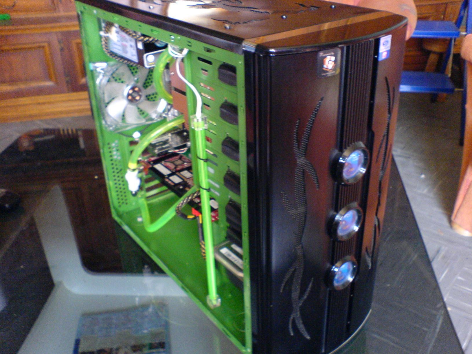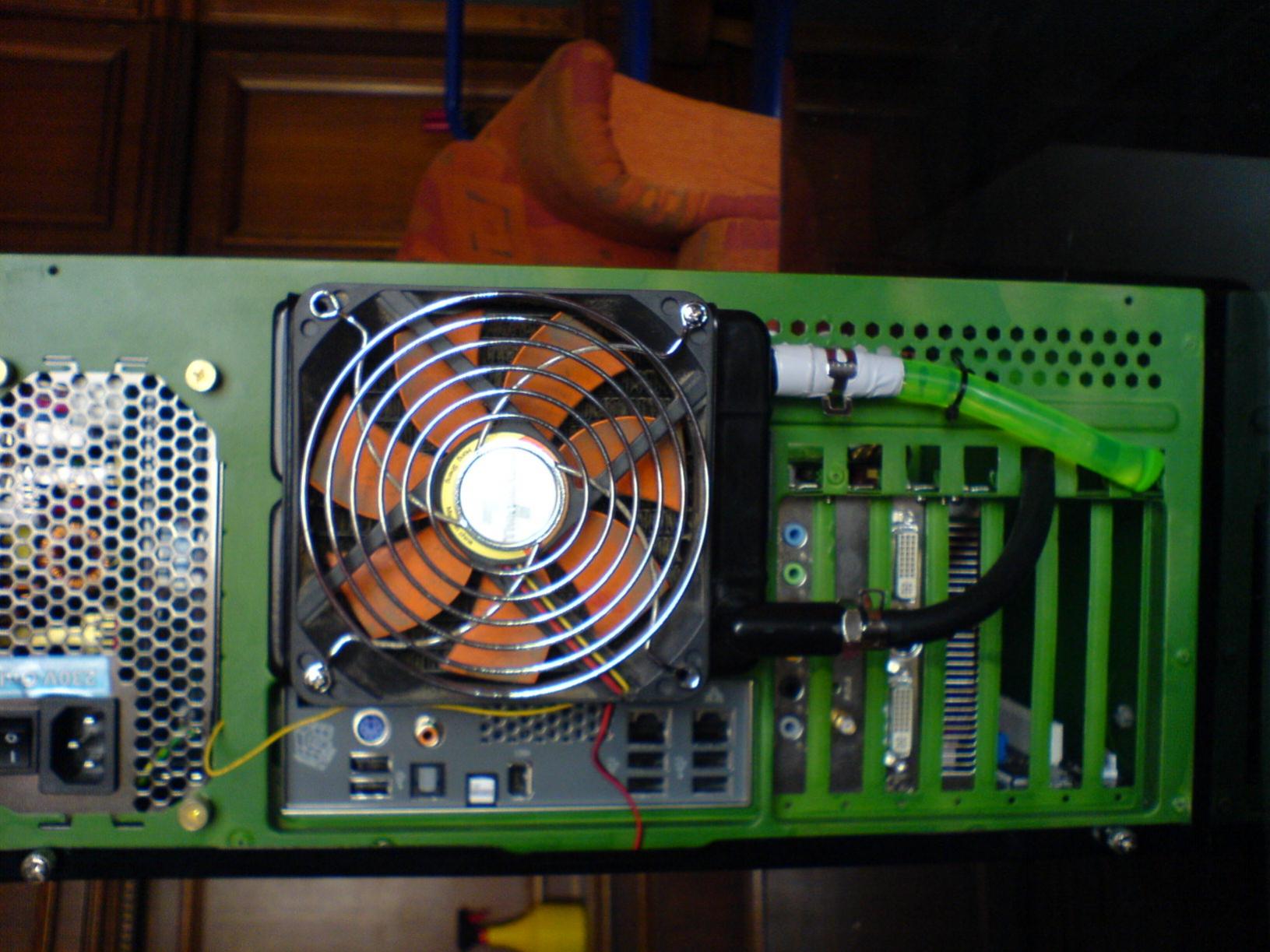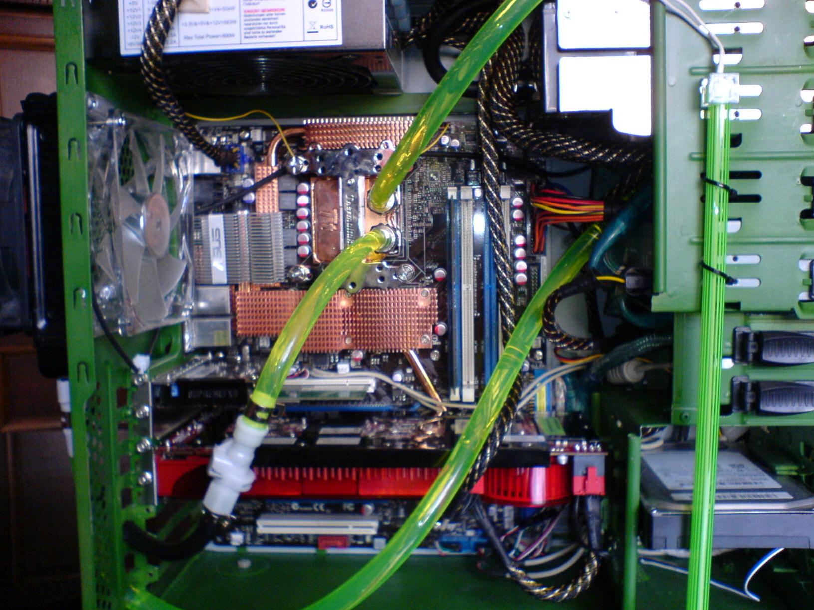 innen habe ich das gehäuse grün gespruht und aussen mit schwarz nachgebessert den kühlkörper von der fertigwakü habe ich ausgebaut und auf die rückseite des gehäuses gemacht mit 2 lüftern!