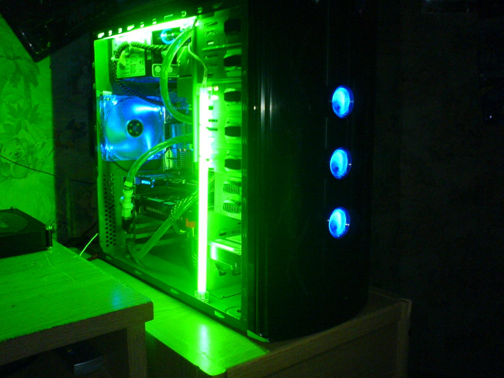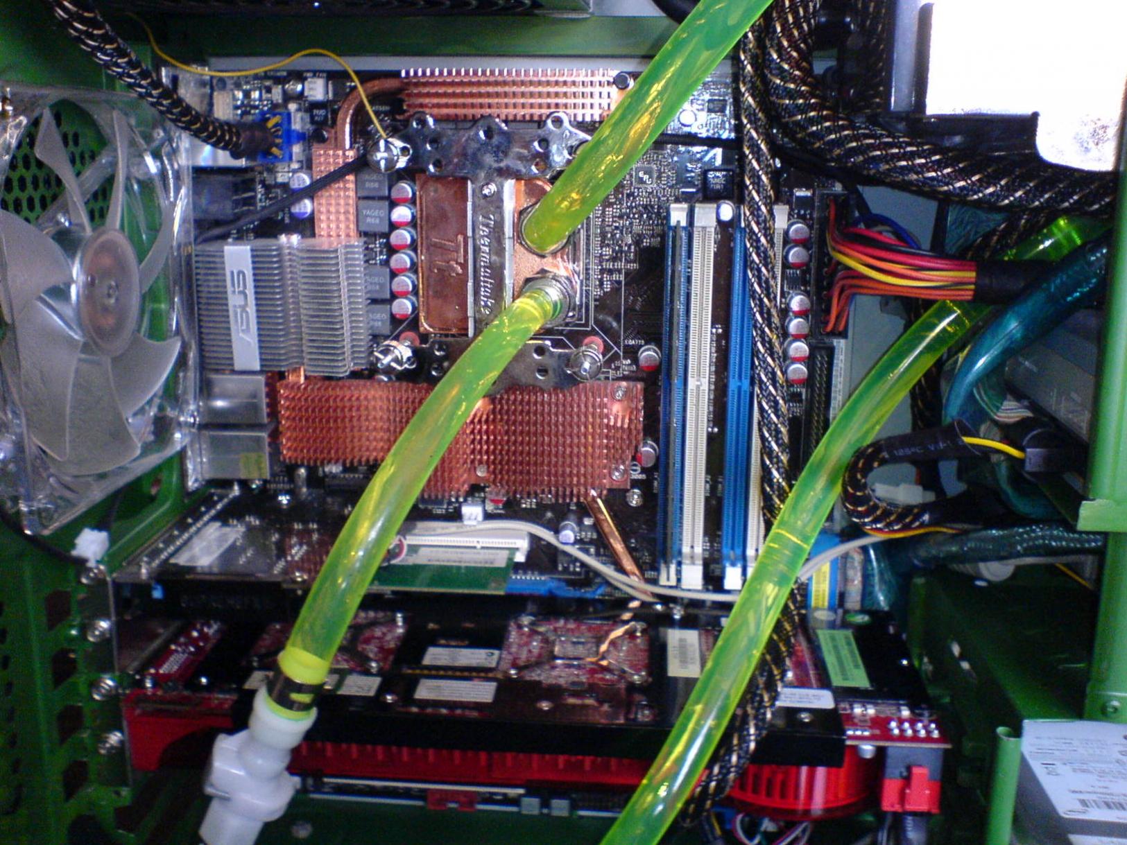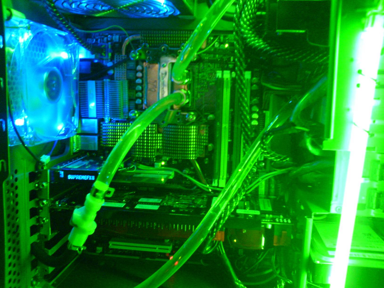 innen habe ich das gehäuse grün gespruht und aussen mit schwarz nachgebessert den kühlkörper von der fertigwakü habe ich ausgebaut und auf die rückseite des gehäuses gemacht mit 2 lüftern!