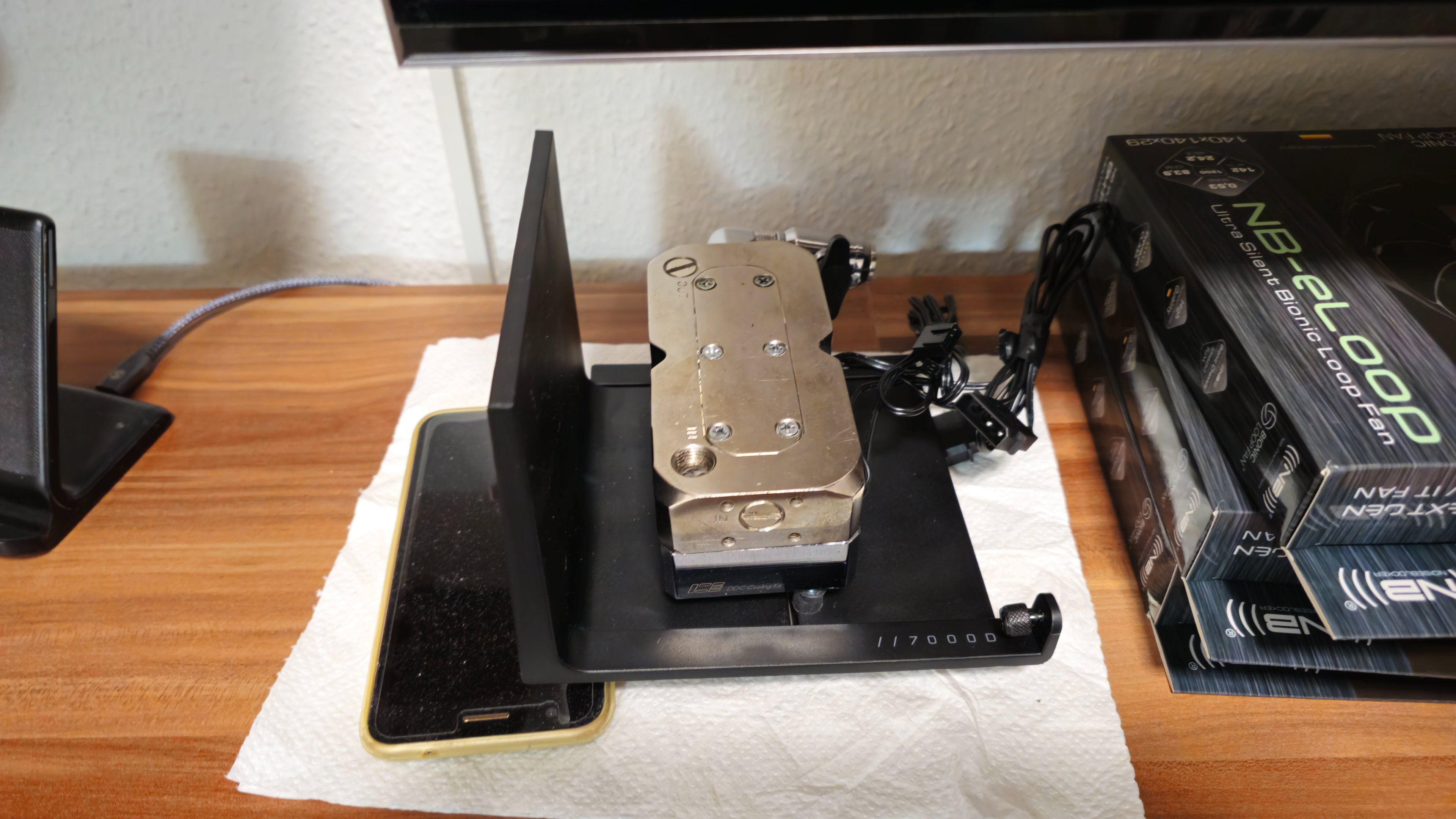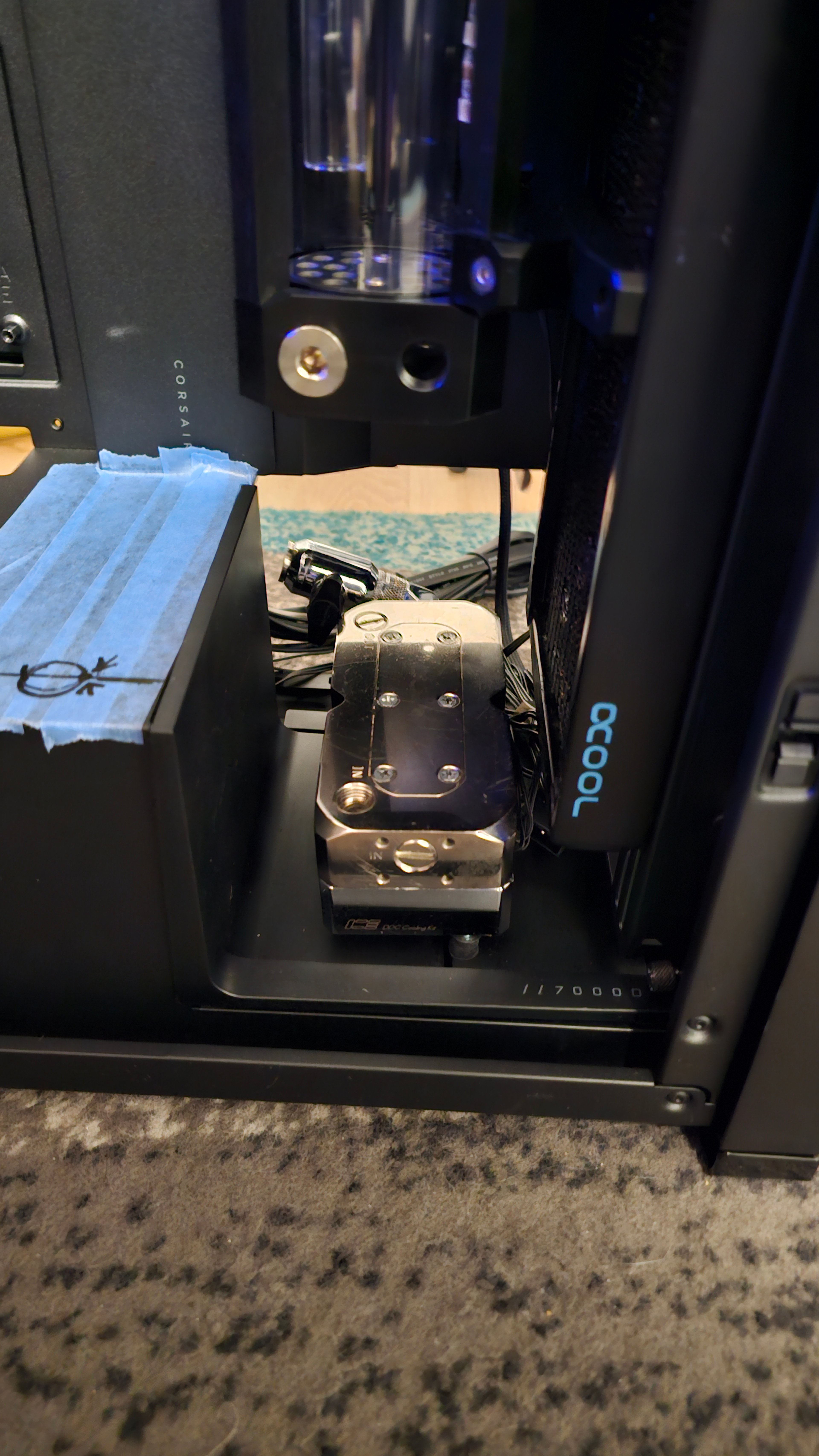Bin mir aber nicht sicher, vielleicht setzte ich sie auch wieder unterhalb in der Netzteilabdeckung. Denn ich müsste sie ansonsten direkt mit Hardtube anbinden. Das müsste sogar mit den Eiszapfen PRO 13 mm Anschlüsse gehen, da hier der Gummikeil gut entkoppeln müsste. Die Pumpe ist aber mit dem Aufsatz bereits sehr ruhig, da hiermit nur eine sehr geringe Resonanz erzeugt wird.
