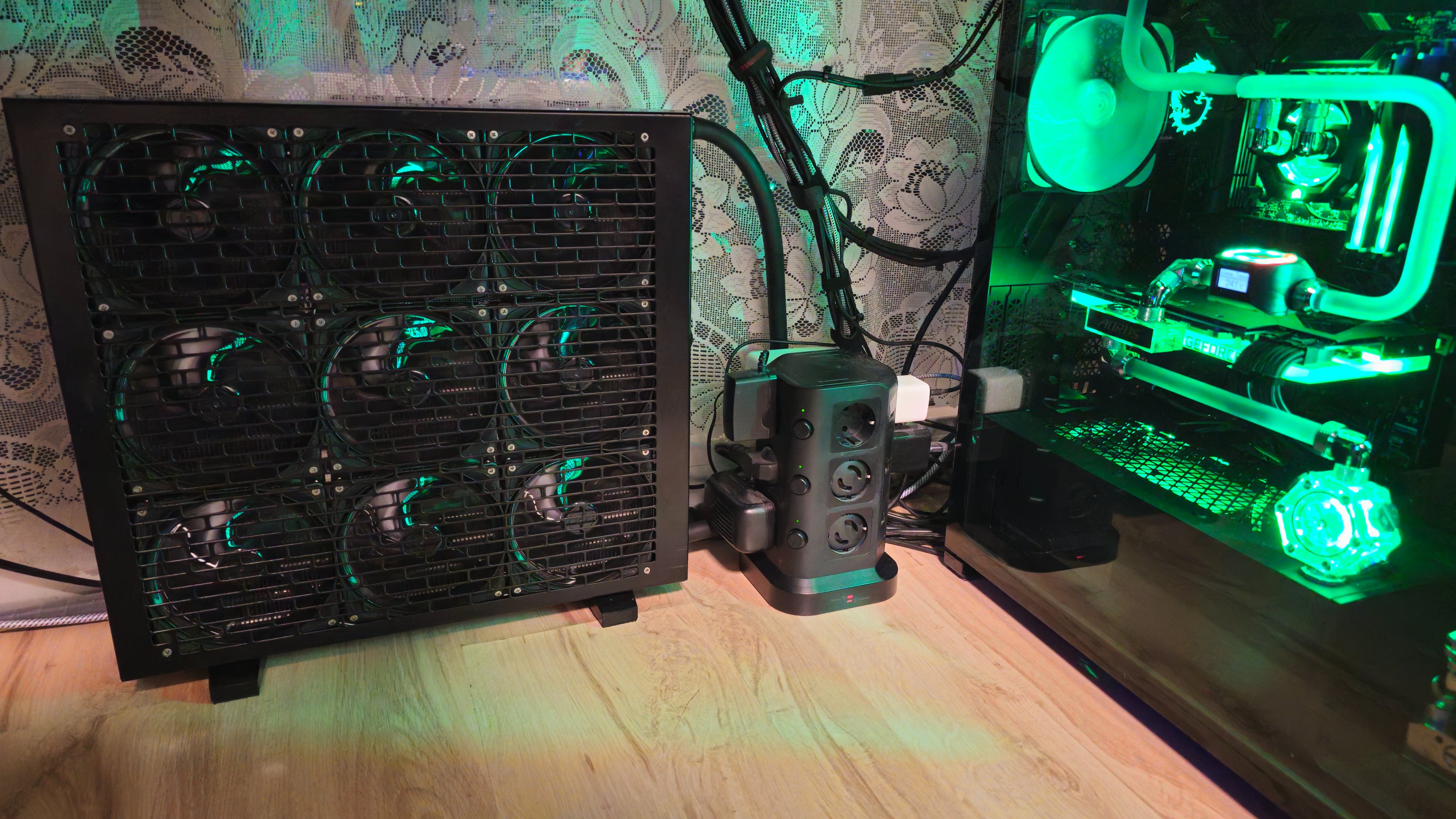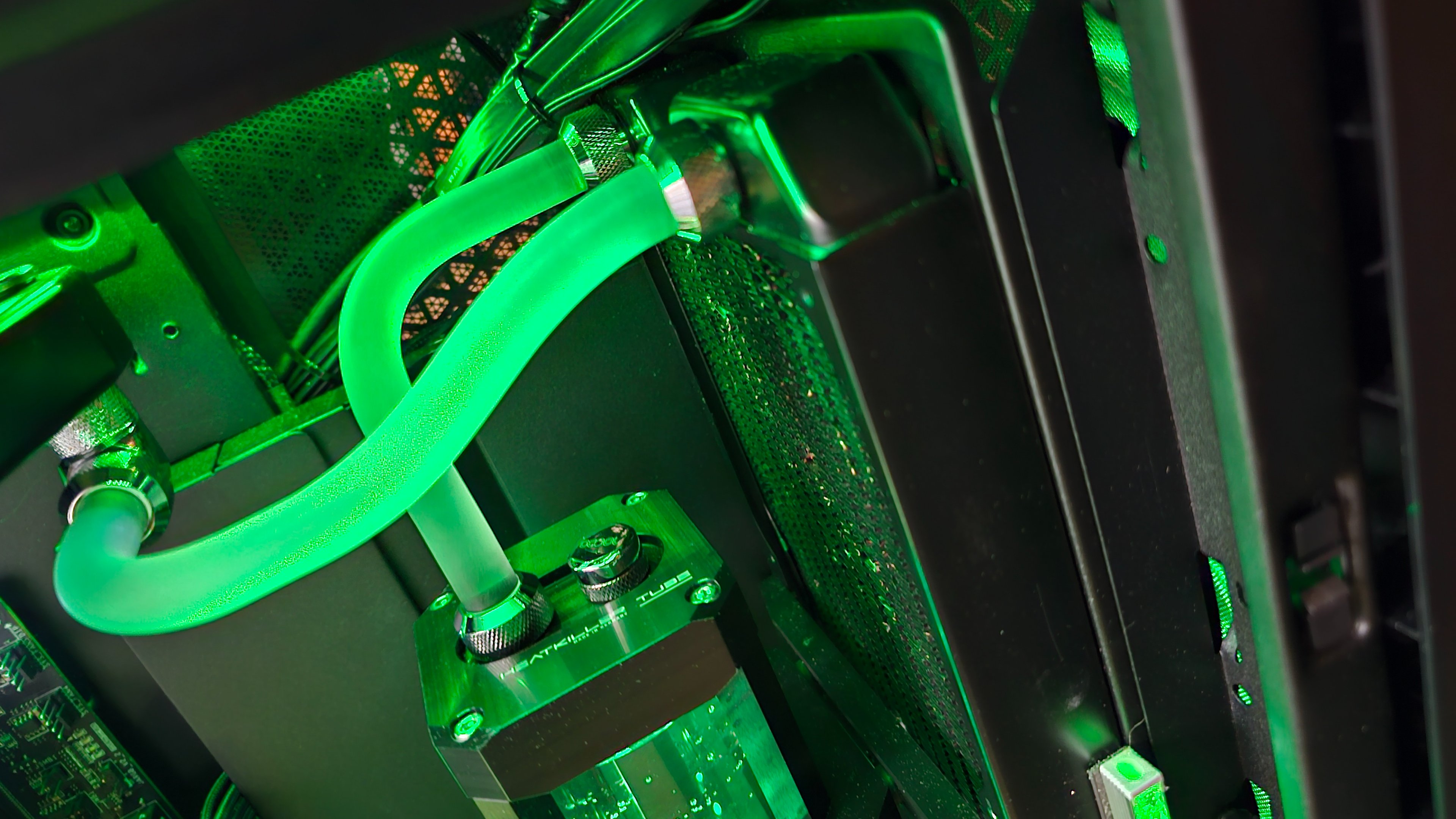 Von der Grafikkarte geht es dann unten zu einem Verteilerwürfel und oben über dem zweiten Würfel zum CPU-Kühler.