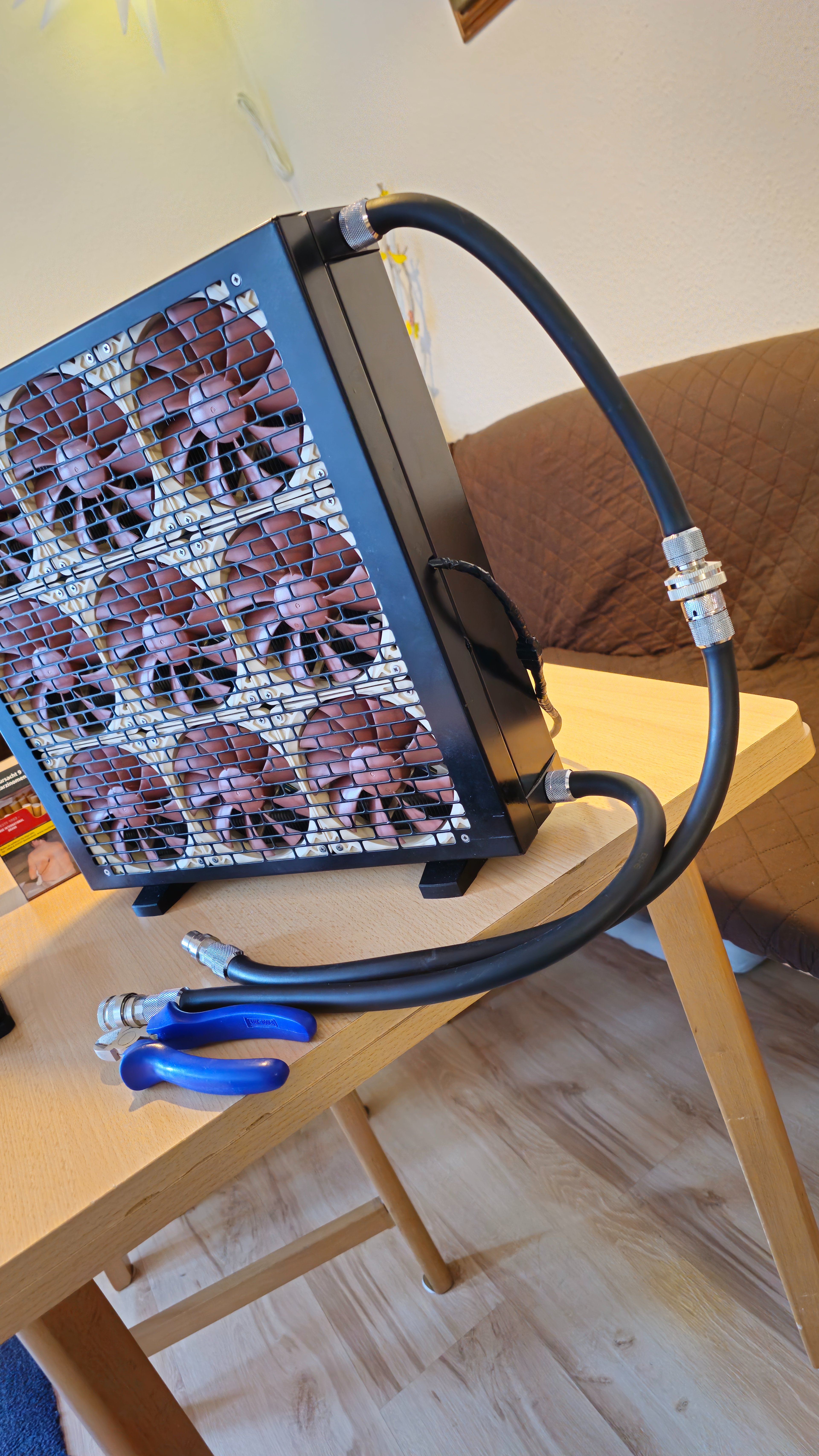 Zwischen dem Rechner zum Mora habe ich momentan 13 mm Tüllen mit Kabelbinder montiert und diese möchte ich jetzt hauptsächlich aus optischen Gründen austauschen. Im Grunde müsste ich nur 8 Schlauchanschlüsse haben, aber da mein Schlauch an der Stelle wo zuvor der Alphacool Filter gesetzt war, gestückelt ist, muss ich dort eine Verbindung mit einem Adapter wieder dazwischen setzen.