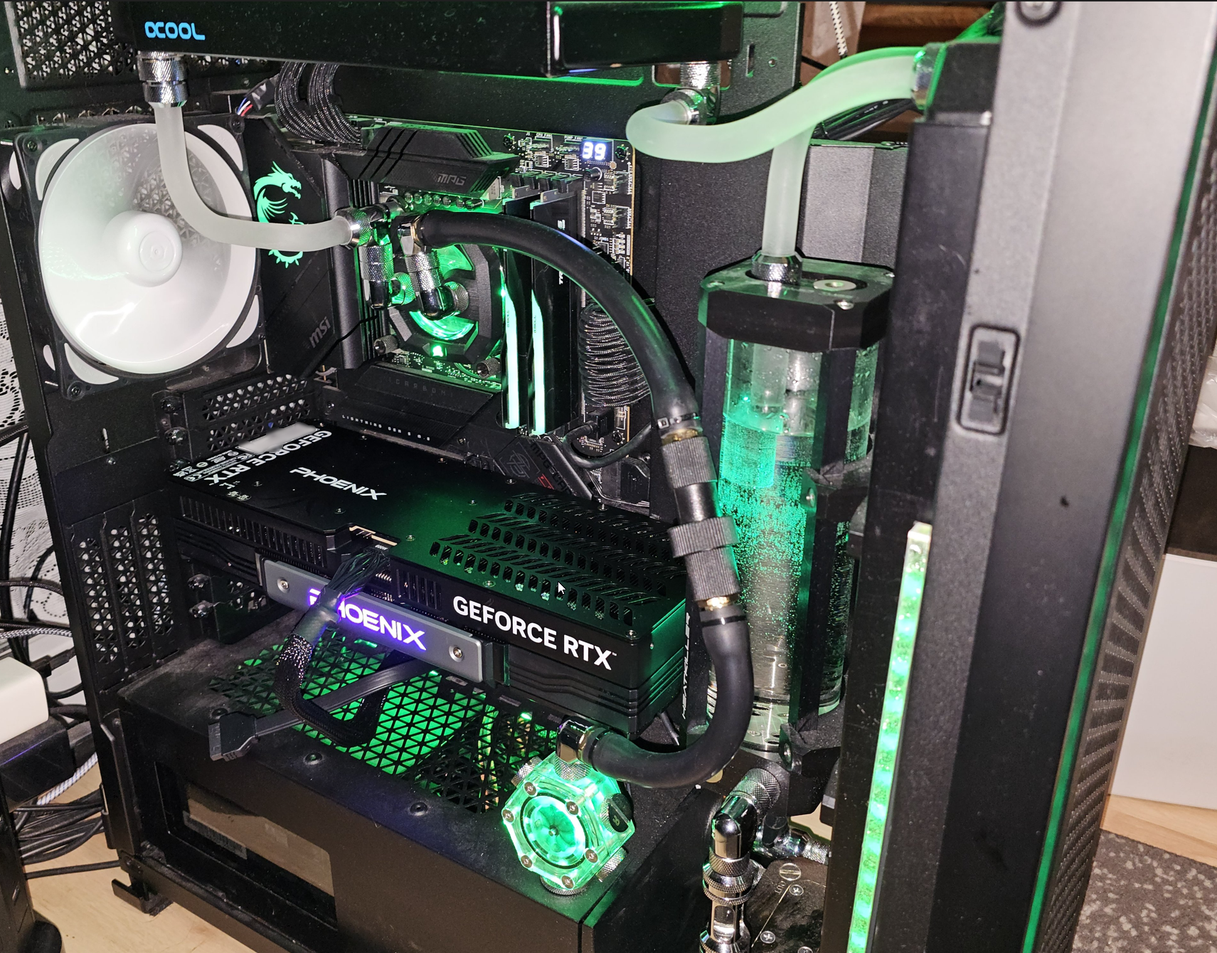 Mit den zwei Schnellkuppelungen hat auch meine Idee dazu gut geklappt, denn nun musste ich kein Wasser erneut ablassen und einfach die umgebaute Grafikkarte mit in den Loop einbinden. So habe ich vor den Hardtubes die umgebaute Grafikkarte auch kurz testen können.
