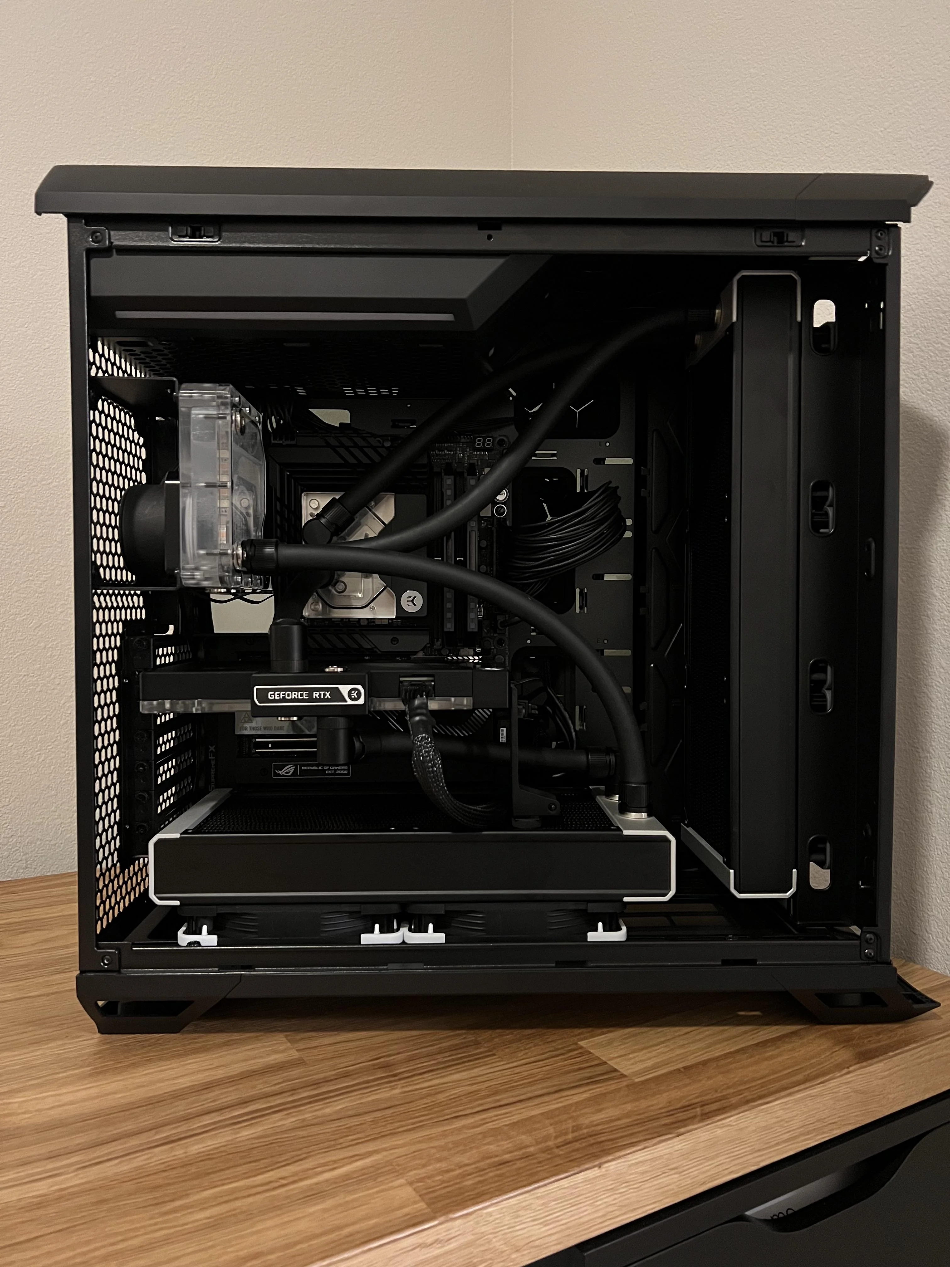 Hallo, ich möchte mich mal wieder an einer WaKü versuchen und könnte da noch vielleicht ein paar Tipps oder Ratschläge gebrauchen. Meine letzte WaKü lief nicht sehr überzeugend, damals wurde ein AMD Ryzen 9 5950X und eine 16GB Radeon VII mittels eines EK Velocity CPU- und GPU-Kühlers gekühlt. Als Radiatoren kamen 2x EK CoolStream SE 240 (Dual-Slim) in einem Fractal Design Define Mini C TG zum Einsatz, was sich im Nachblick betrachtet vielleicht doch als etwas zu sportlich heraus stellte. Ich hatte damals unbedingt den µATX Formfaktor im Kopf und wollte keinesfalls davon lassen. Jedenfalls rüstete ich die Kühlung wegen diverser Probleme (Undichtigkeiten, klackernde EK-Lüfter, schlechte Temperaturen, Verstopfungen durch Kühlmittel weil ich mal kein reines destilliertes Waser wie sonst immer benutzt habe) bald wieder auf eine sehr gute Luftkühlung zurück und die WaKü-Teile flogen in die Grabbel-Ecke. Nun allerdings möchte ich einen neuen Anlauf wagen, diesmal allerdings im (kompakten) Standard-ATX-Format.