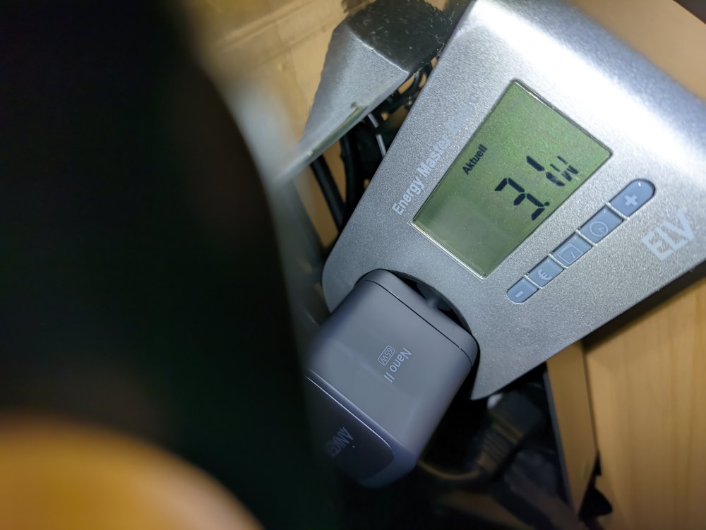 Das Messgerät zeigte größtenteils Werte schwankend zwischen 3,0 - 3,6 Watt, ungefähr alle 10 Sekunden gab es einen kurzen Peak auf 5,x Watt.