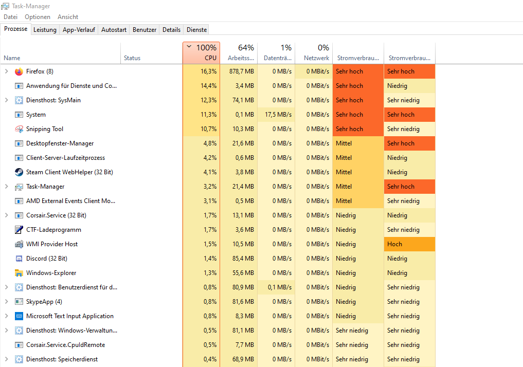 Hallo, ich habe mir erst vor einer Woche einen neuen PC zusammengebaut. Sobald ich den PC starte habe ich eine Prozessor Auslastung von 100%. Ich habe alle Prozesse beendet und nichts ändert sich. Ich habe den AMD 3600 auf dem MSI B450 Tomahawk Max. Ich finde keine Lösung die Auslastung zu senken. Würde mich über Hilfe sehr freuen.