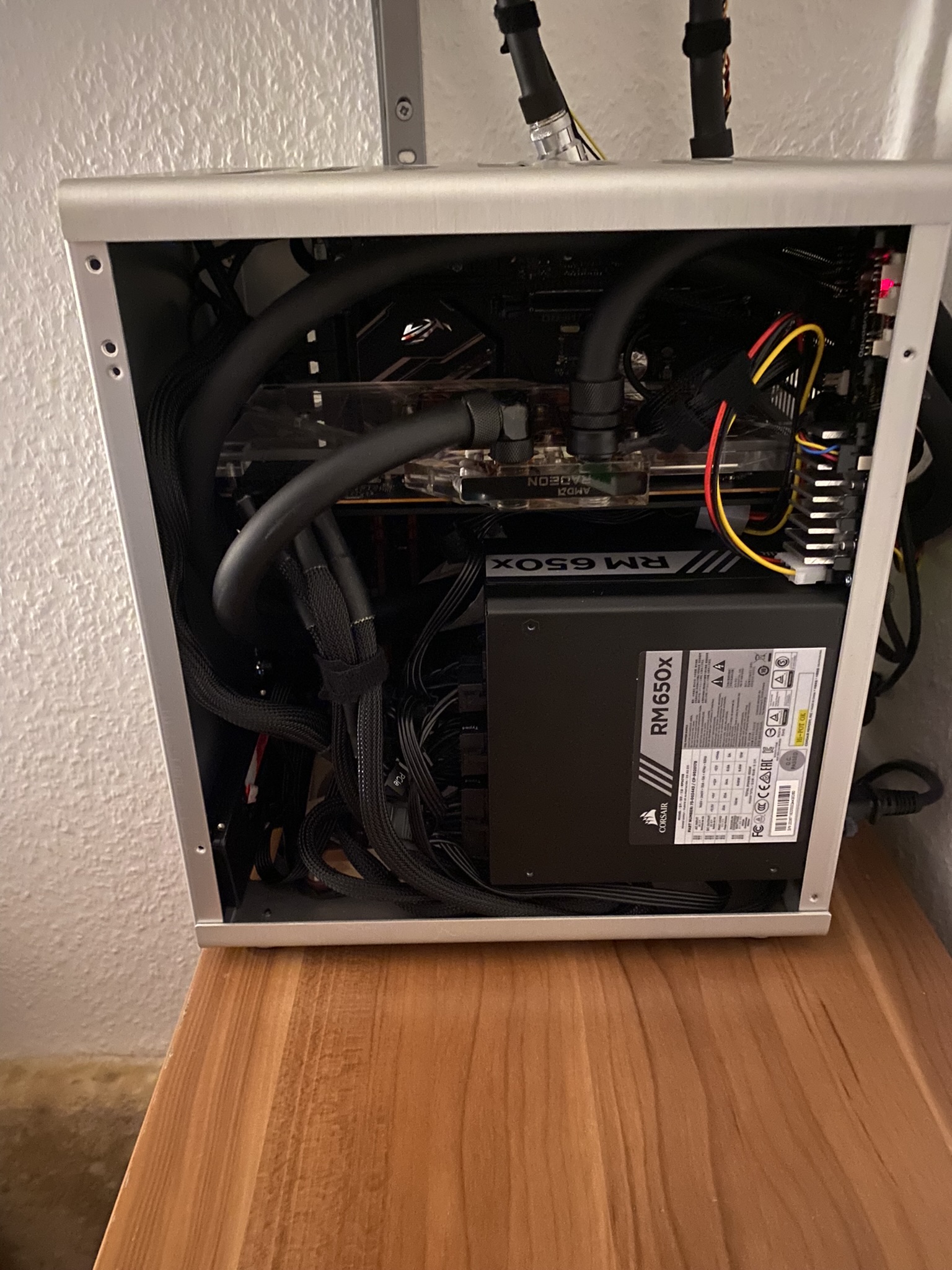 Nur das untere Rohr würde ich noch etwas länger in der Vertikalen machen, damit es richtig winklig horizontal/vertikal ist. Mein kommender Build wird optisch nicht ganz an deinen heran reichen, ich verschlauche alles nur.
