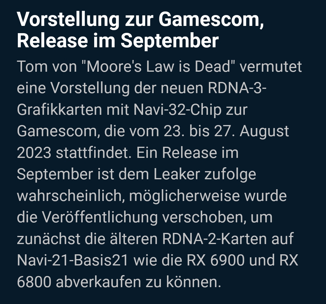 die 7800 von AMD soll im Rahmen der Gamescom vorgestellt werden, also diese Woche? oder nächste?Reckless911 schrieb:Grafikkarten