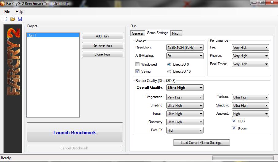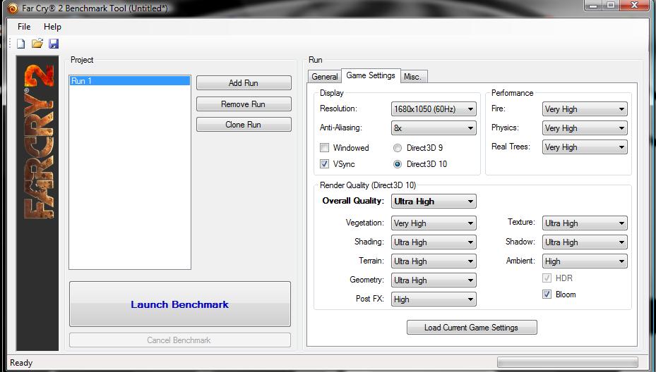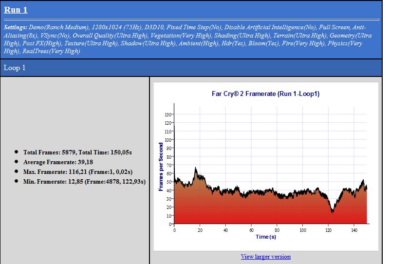 Settings: Demo(Ranch Long), 1920x1080 (60Hz), D3D10, Fixed Time Step(No), Disable Artificial Intelligence(No), Full Screen, Anti-Aliasing(None), VSync(No), Overall Quality(Ultra High), Vegetation(Very High), Shading(Ultra High), Terrain(Ultra High), Geometry(Ultra High), Post FX(High), Texture(Ultra High), Shadow(Ultra High), Ambient(High), Hdr(Yes), Bloom(Yes), Fire(Very High), Physics(Very High), RealTrees(Very High)