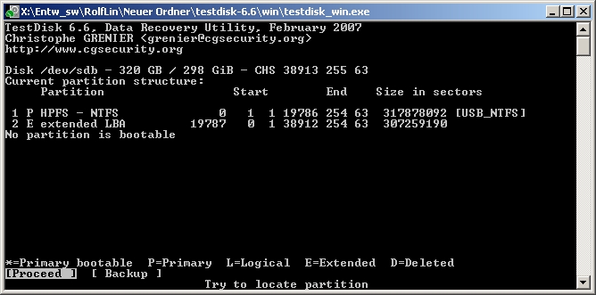 Teile auchmal mit, ob du auch gleich die zweite Partition erstellen wolltest?Als PartitionType wird in TESTDISK unter Advanced der aktuelle Type "0f" angezeigt !