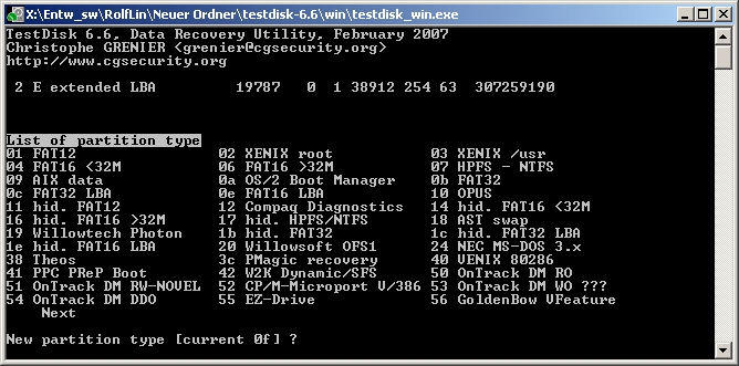 Vielleicht sagt jemandem der 4.Screenshot auch etwas: Als PartitionType wird in TESTDISK unter Advanced der aktuelle Type "0f" angezeigt !