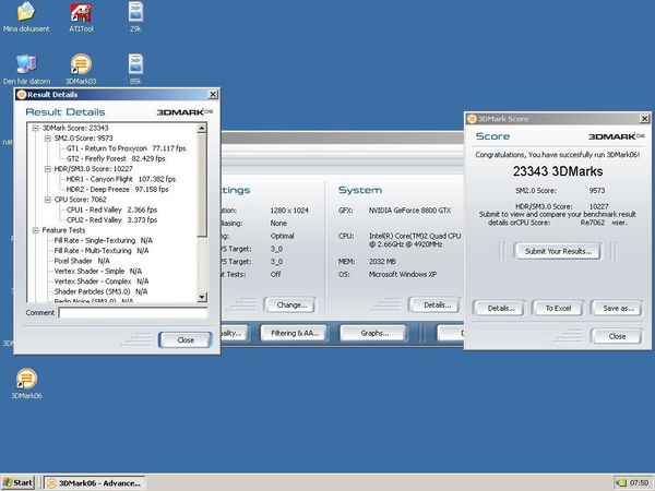 @Crimson_LP: Ich sehe gerade, dass du ja ne 7600GT AGP mit dem Takt 625/1632MHz hast. Das wird der Grund sein, warum du mehr Benchpunkte hast als ich, denn meine 7699GT läuft nur mit 560/1400MHz.